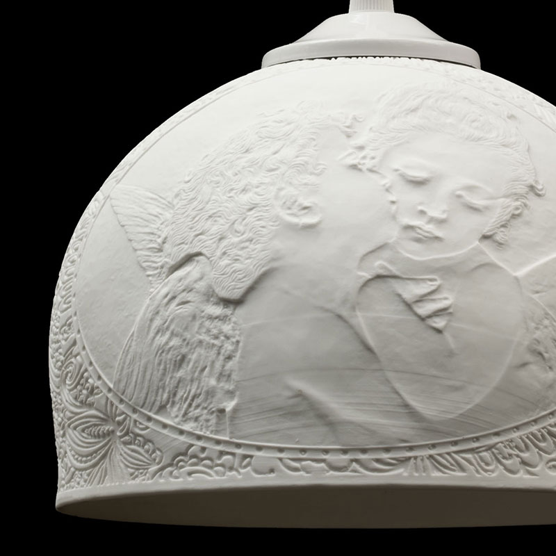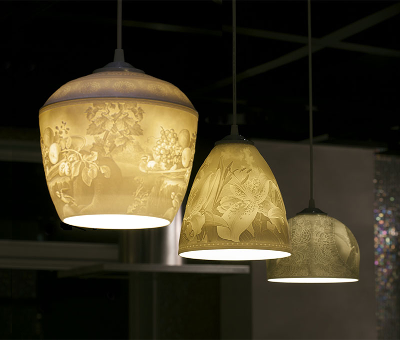 ポーセリンの厚みを変えることで、シェード部分の繊細なレリーフが浮かび上がる磁器製のLEDペンダントランプ。