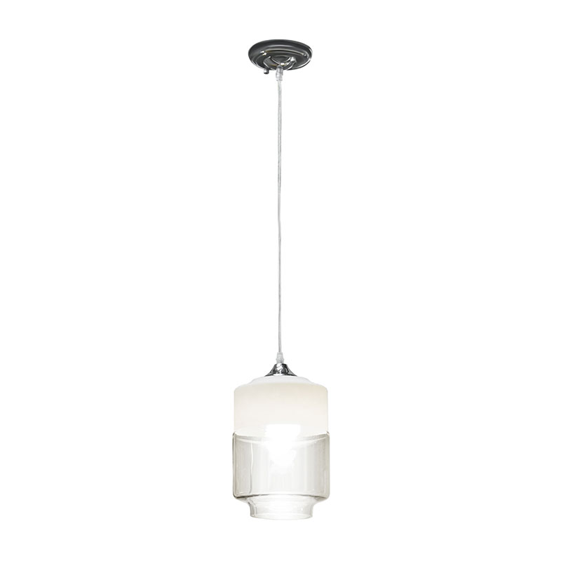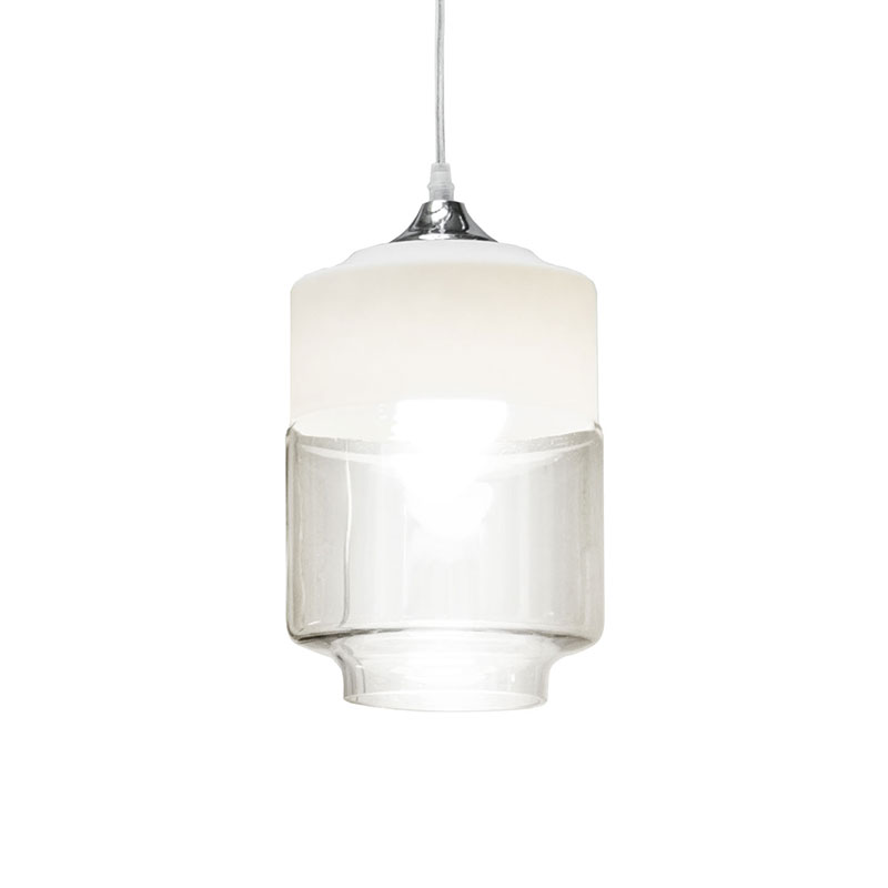 アンバーとホワイトに分かれたガラスシェードの吊り下げタイプのLED照明です。天井カバーキャップと本体もメッキ仕上げ。