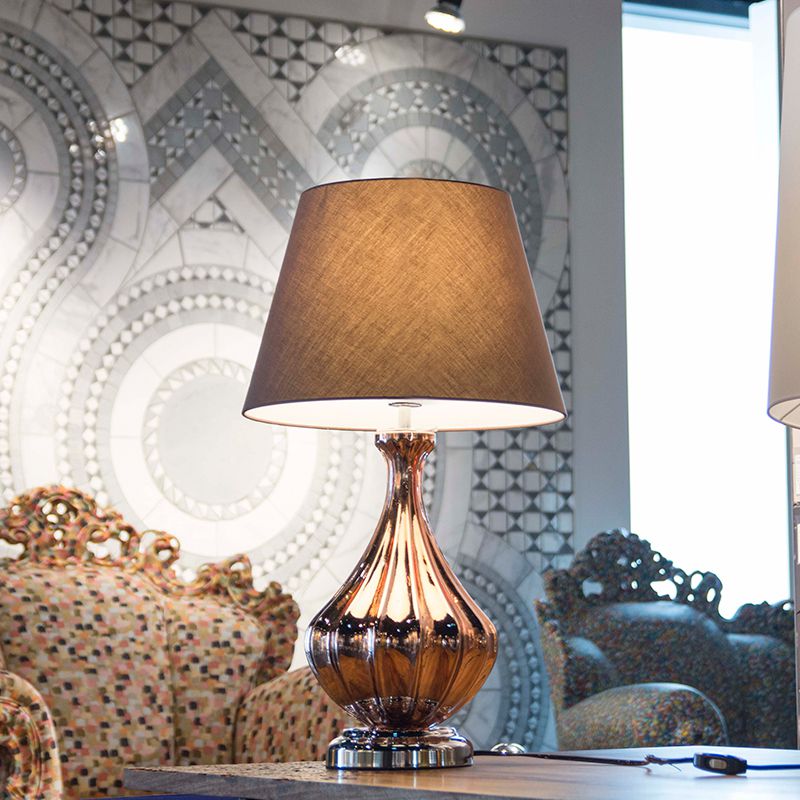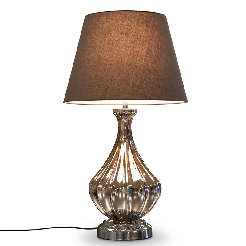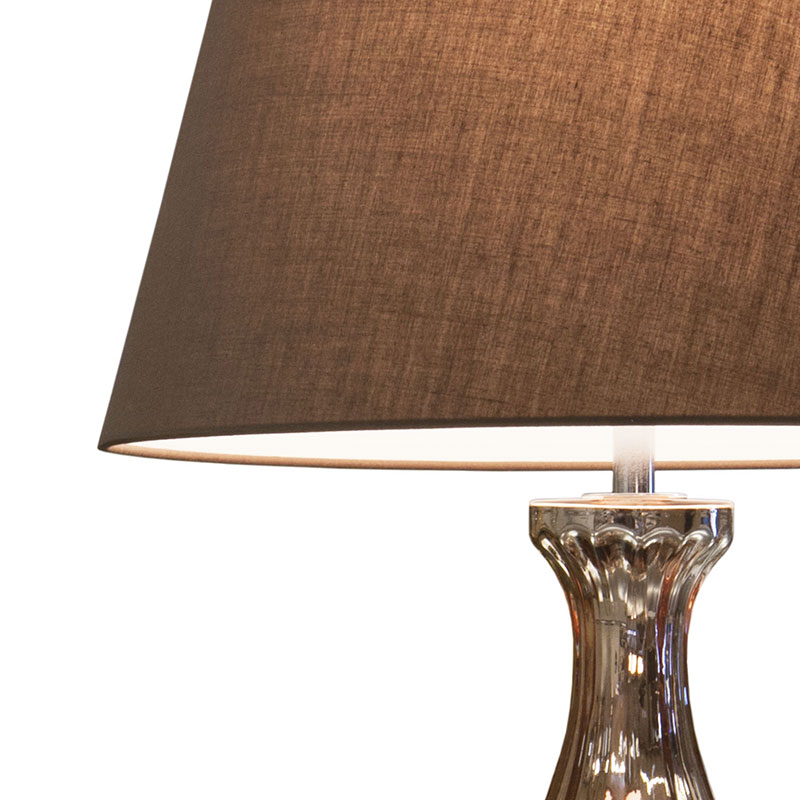ガラス製スタンドに落ち着いたコーヒーカラーのシェードが付いたテーブル置きタイプのLED照明です。電源コードには中間スイッチが付いています。