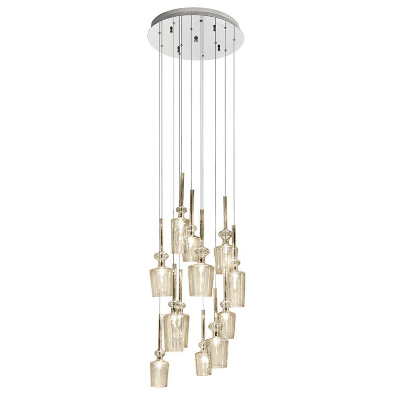 コニャック色の大きさが異なるガラスシェードを12個吊り下げた照明。天井プレートと照明本体はメッキ仕上げです。