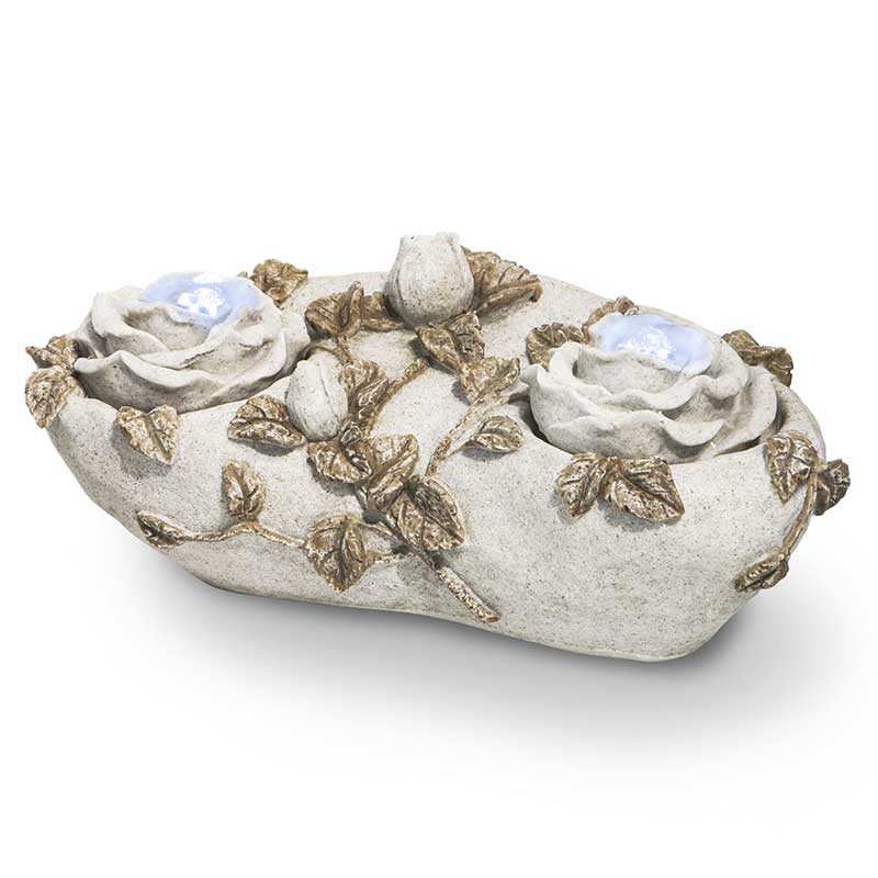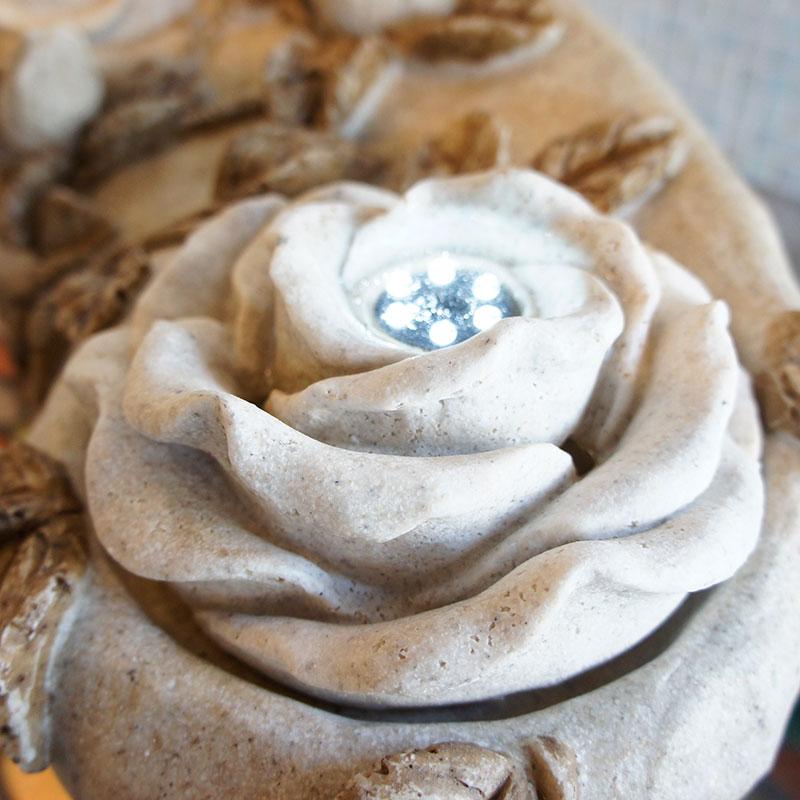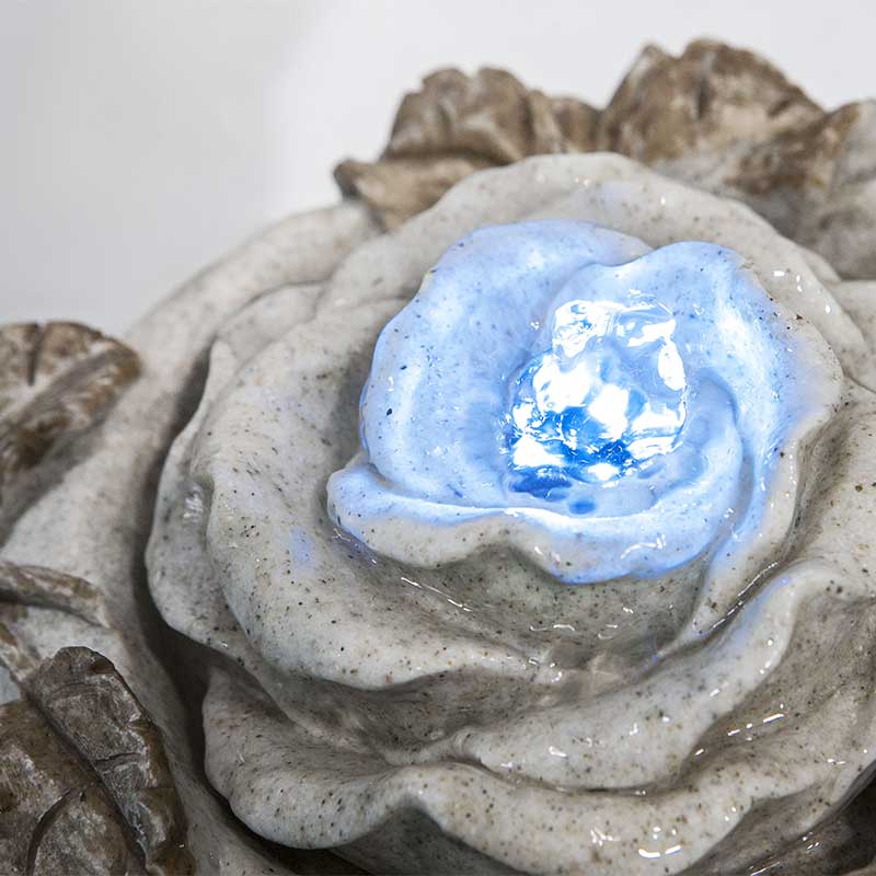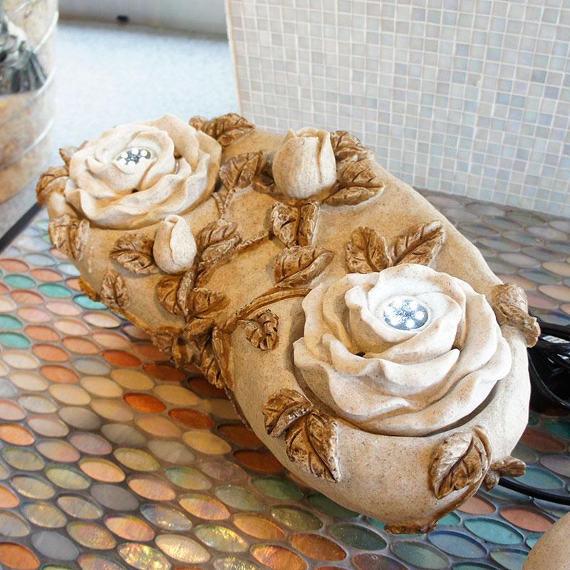 循環ポンプで上部中央から水が湧き、優しいせせらぎの音を響かせながら水が流れ落ちます。ほのかに灯るLED照明が水の揺らめきを照らします。