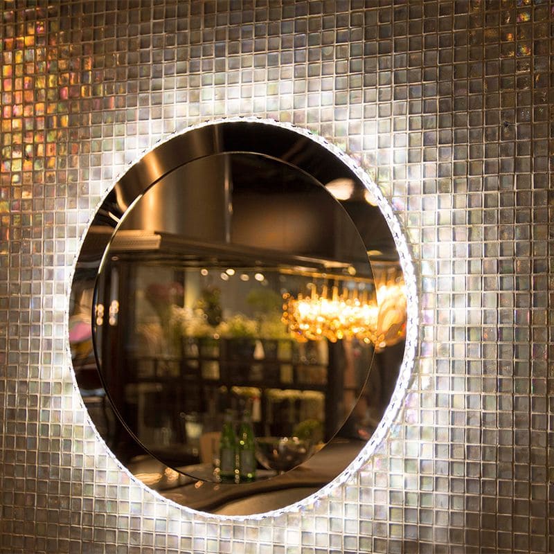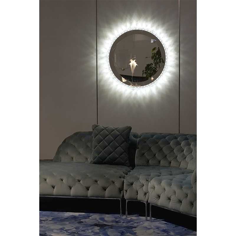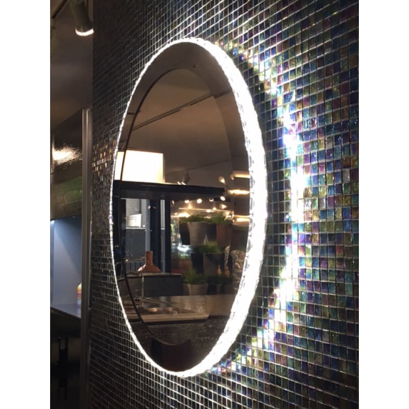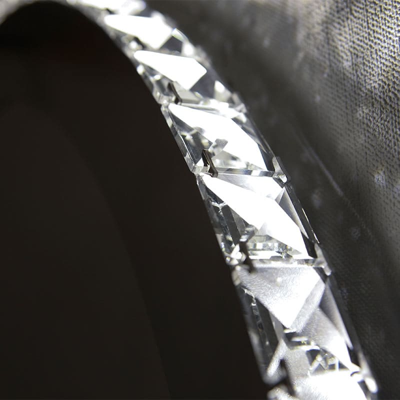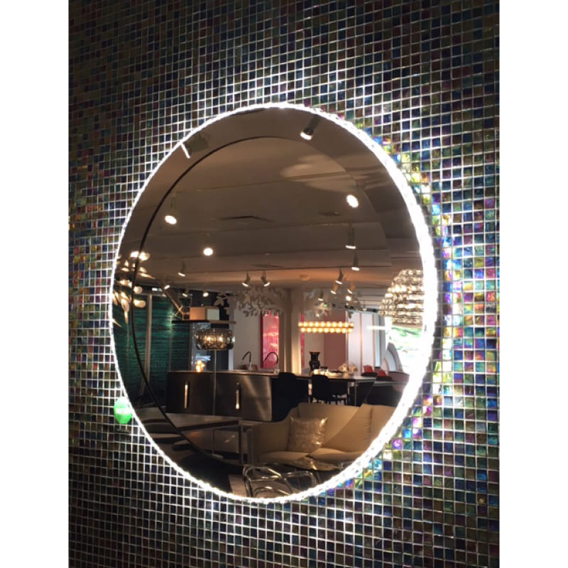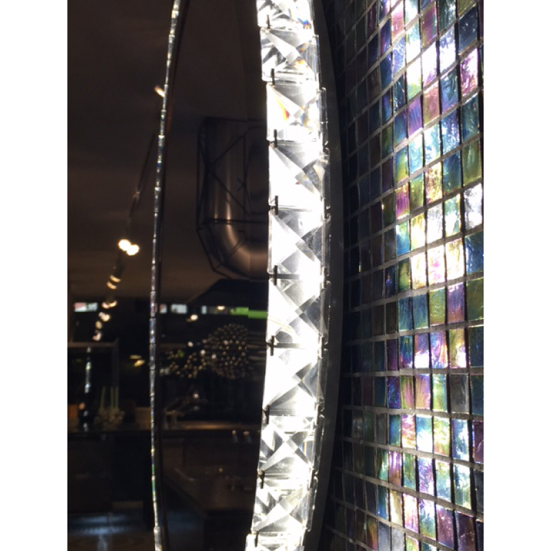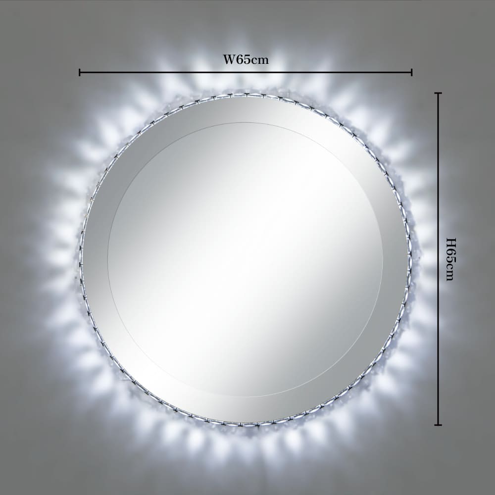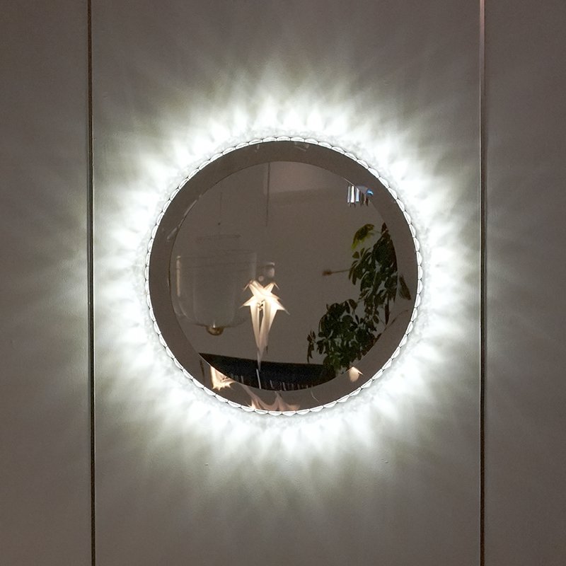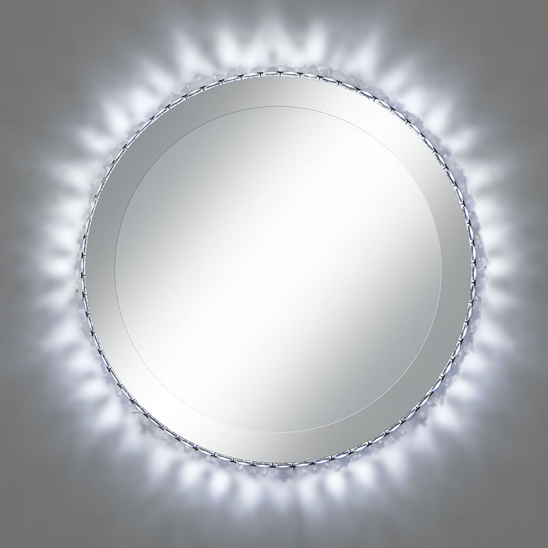 カットガラスのオーナメントが周りに付けられた壁付けタイプのミラーLED照明です。本体枠も鏡面仕上げです。