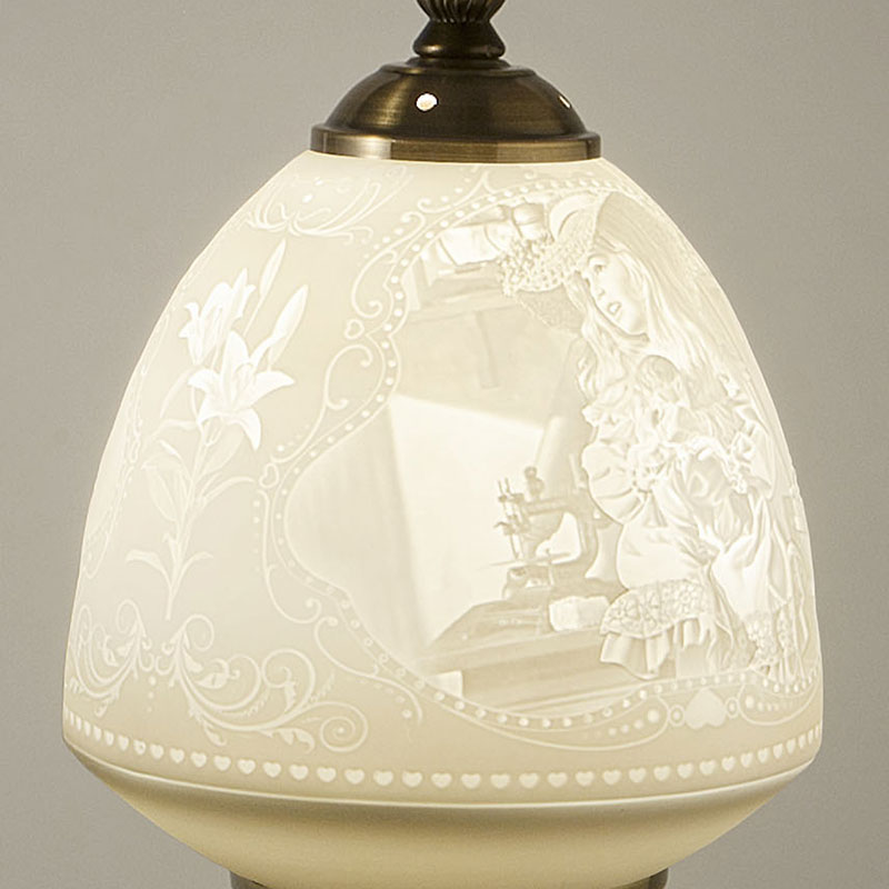 繊細な絵柄が施された磁器のシェードがLEDの明かりによって立体的に浮かび上がるテーブルタイプの照明です。本体は銅板柄の仕上げ。