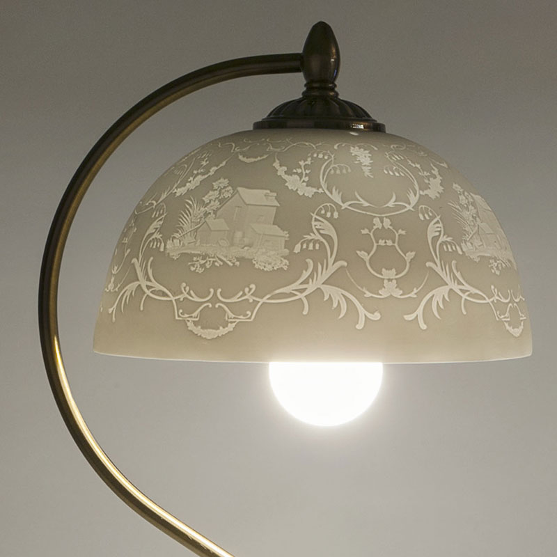 繊細な絵柄が施された磁器のシェードがLEDの明かりによって立体的に浮かび上がるスタンドタイプの照明です。本体は銅板柄の仕上げ。