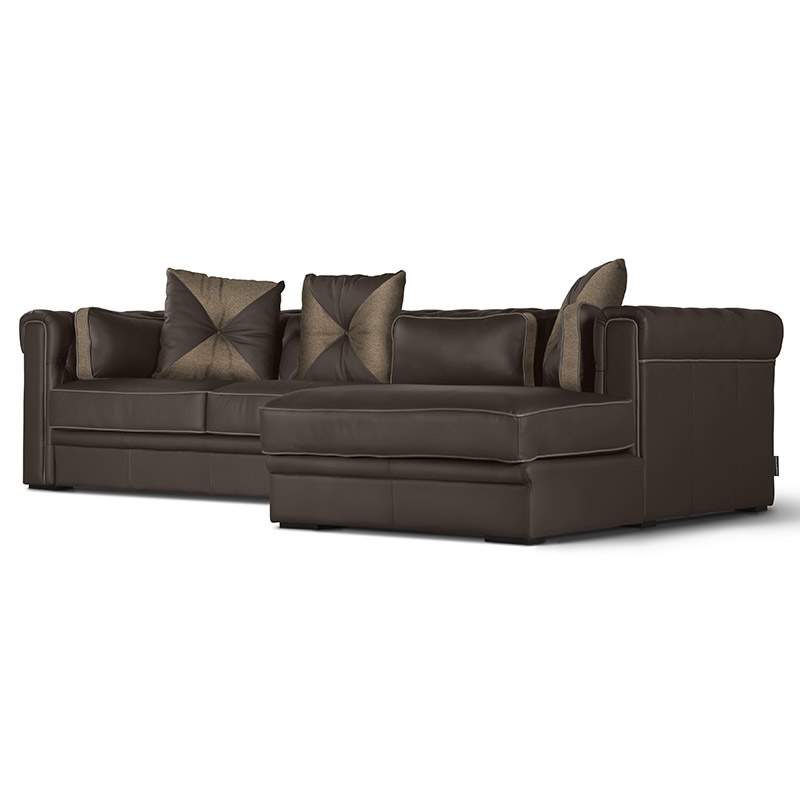 同じレザー素材が使われているクッションが6つ付属しているので、くつろぎ方にあわせ自由にお使いいただけます。カウチは足を伸ばしてくつろいだり、コミュニケーションも取りやすいかたち。飛び出た部分は様々な方向からの着座が可能です。