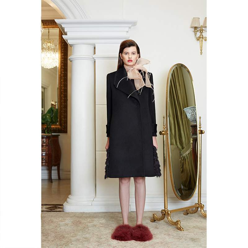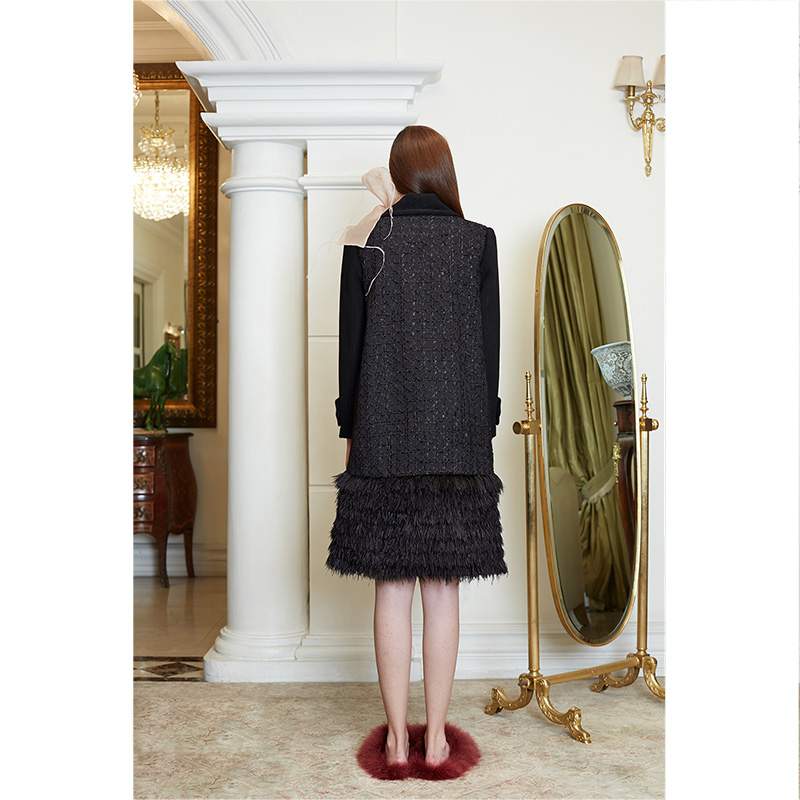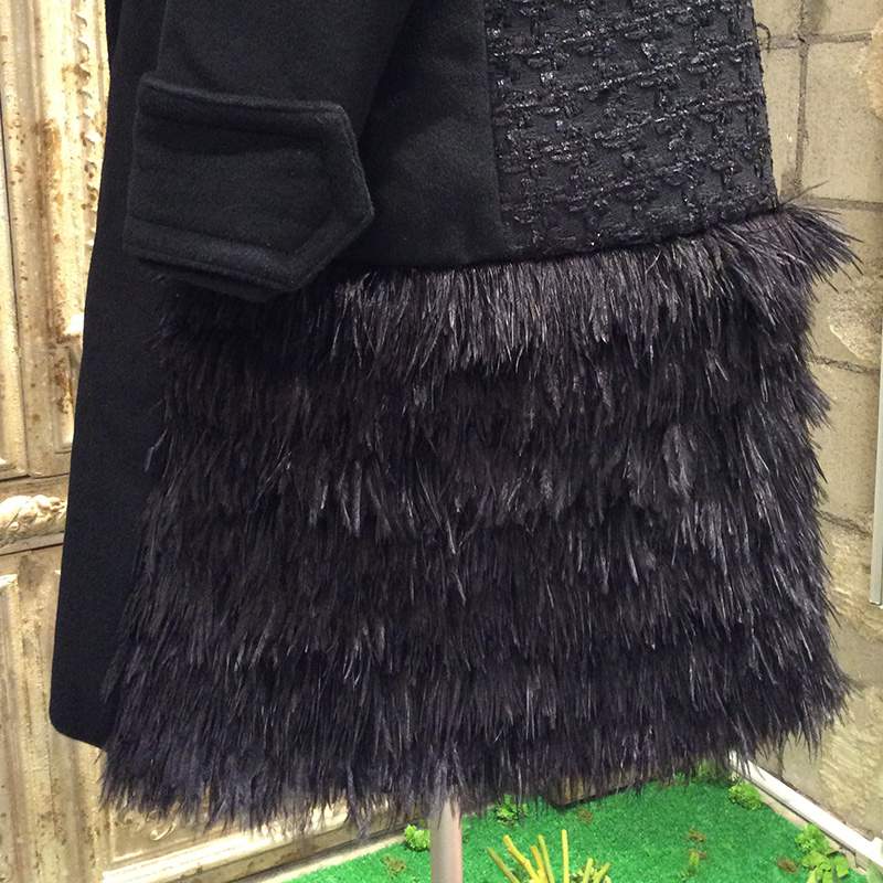• ダブル ブレステッド コート ウィズ ツイード アンド フェザー パネル