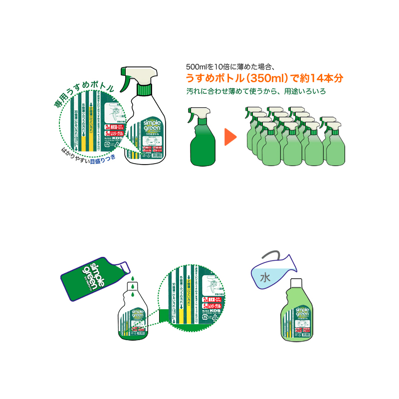 - 製品内容:350ml 濃縮液、スプレー付きうすめボトル、ハンドブック
