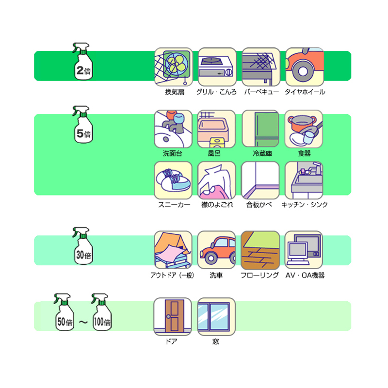 ・濃縮タイプで用途に応じて 5倍〜30倍に薄めて使用します。