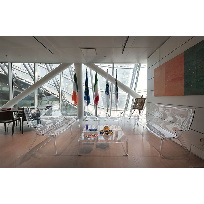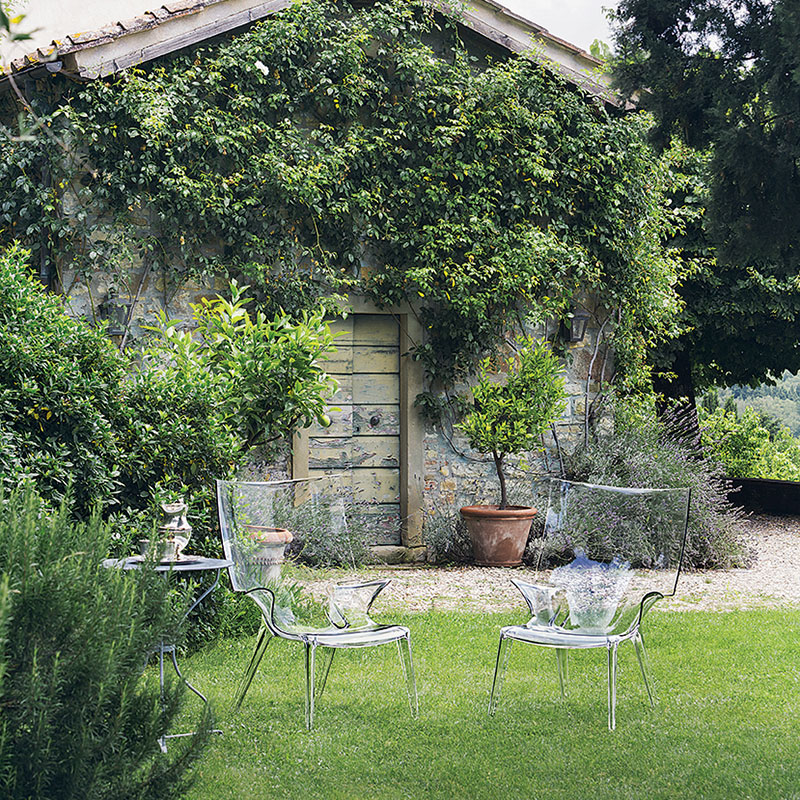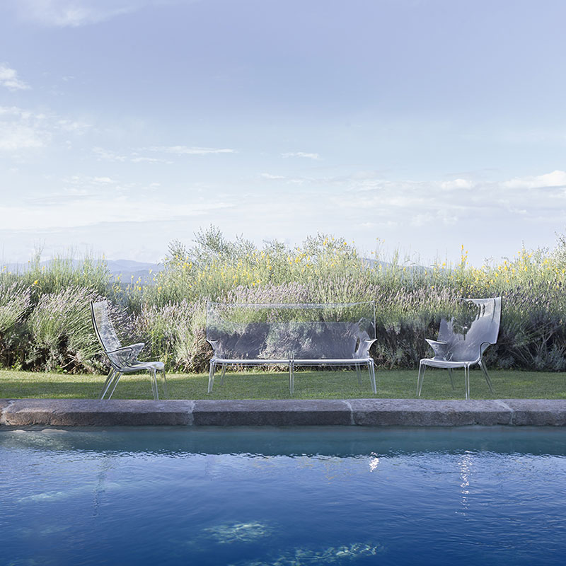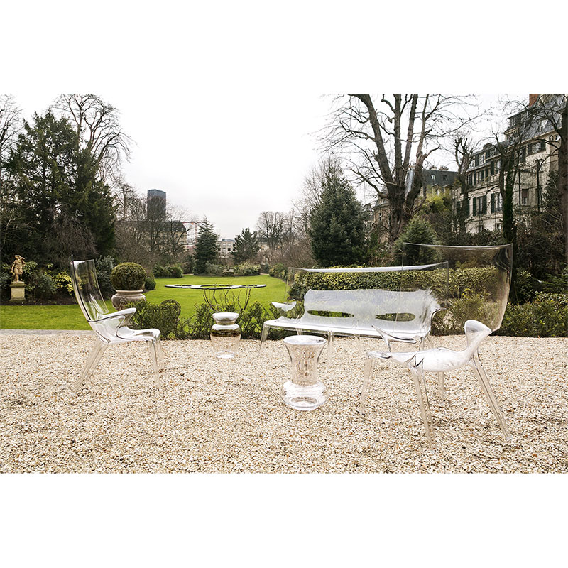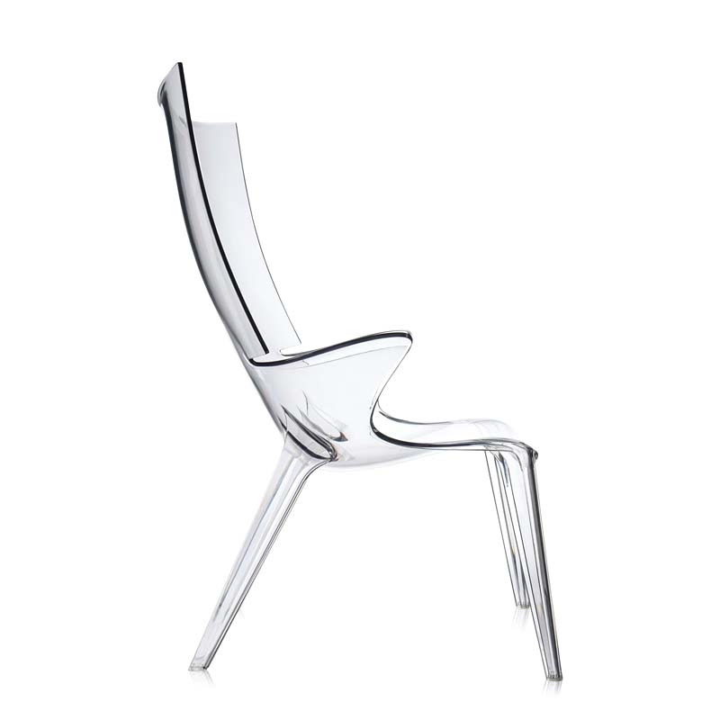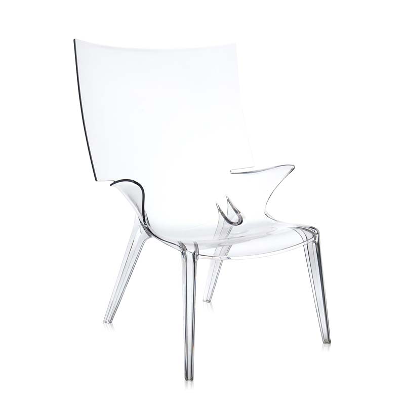 フィリップ・スタルクによる、一体成型透明ポリカーボネート製の革新的チェア、アンクルジムは、曲線美が非常に魅力的なチェアで屋内、屋外を問わずさまざまなインテリアのニーズに対応します。