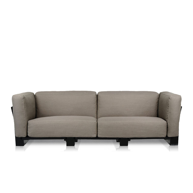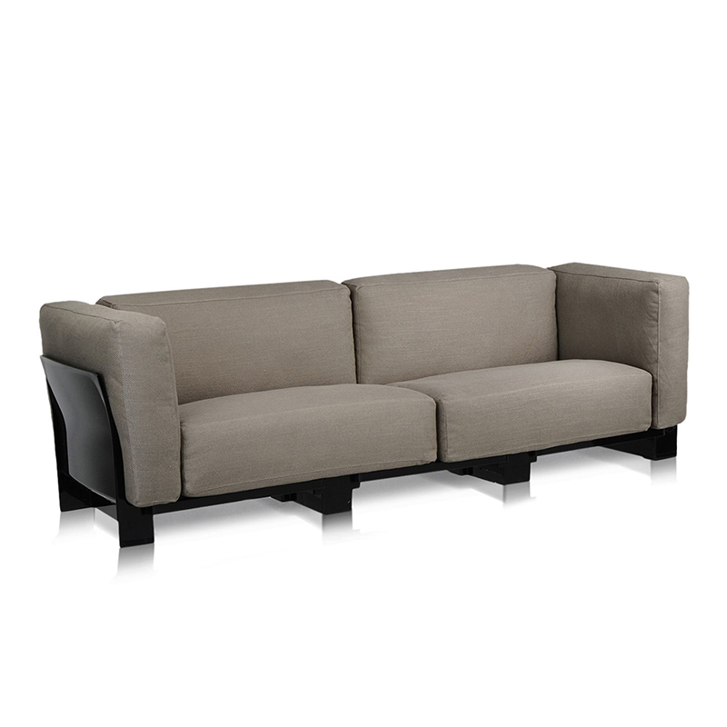 Popは工業技術の成果で実現した初の「無限に延長可能な」システムソファ。透明ポリカーボネート製のモジュールをお好きな個数分だけ組み立てて、背もたれ、座面、アームレスト等、ソファーのフレームを作ります。「プラスチックは堅い」という概念をくつがえし、衝撃や重量に耐え、しかもソフトで心地よい大量生産家具を実現。グースダウンを使用した柔かいクッションはゆったりと大きく、張り地は豊富なバリエーションを取り揃えています。