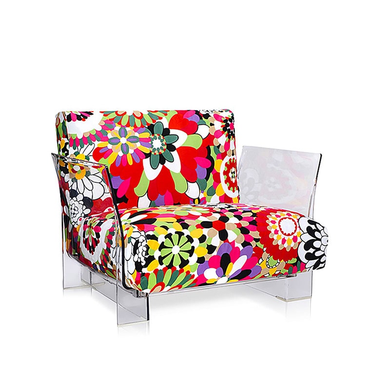 Popは工業技術の成果で実現した初の「無限に延長可能な」システムソファ。透明ポリカーボネート製のモジュールをお好きな個数分だけ組み立てて、背もたれ、座面、アームレスト等、ソファーのフレームを作ります。「プラスチックは堅い」という概念をくつがえし、衝撃や重量に耐え、しかもソフトで心地よい大量生産家具を実現。グースダウンを使用した柔かいクッションはゆったりと大きく、張り地は豊富なバリエーションを取り揃えています。