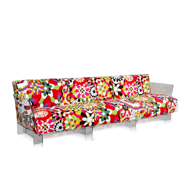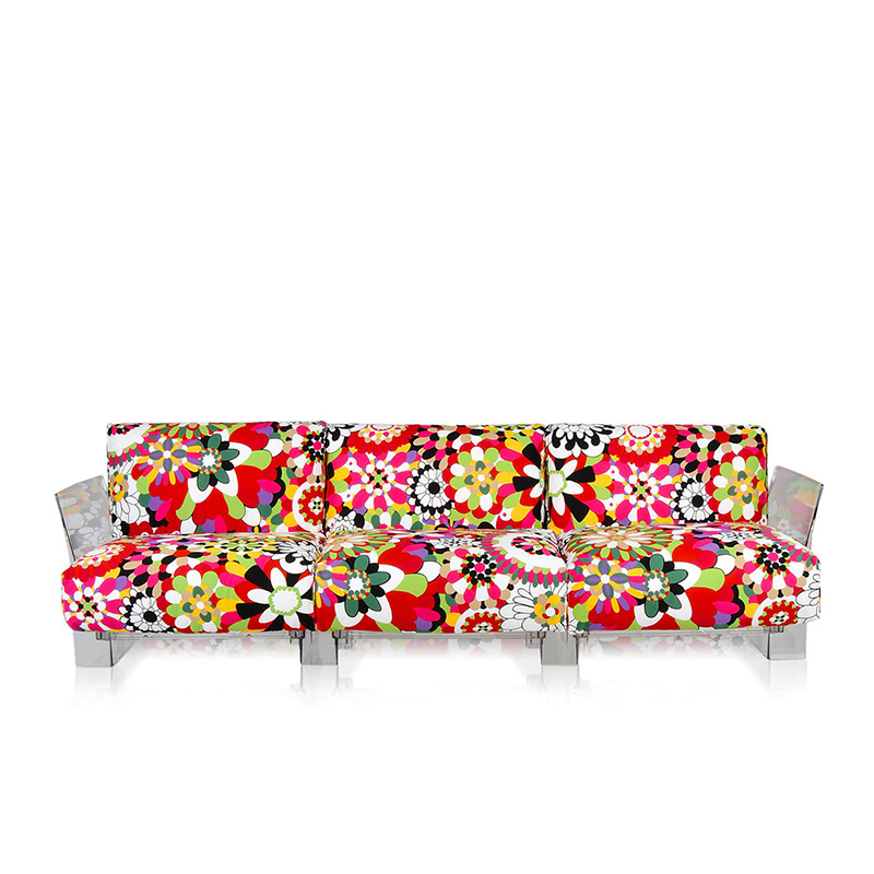 Popは工業技術の成果で実現した初の「無限に延長可能な」システムソファ。透明ポリカーボネート製のモジュールをお好きな個数分だけ組み立てて、背もたれ、座面、アームレスト等、ソファーのフレームを作ります。「プラスチックは堅い」という概念をくつがえし、衝撃や重量に耐え、しかもソフトで心地よい大量生産家具を実現。グースダウンを使用した柔かいクッションはゆったりと大きく、張り地は豊富なバリエーションを取り揃えています。