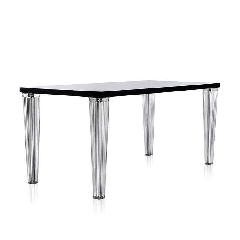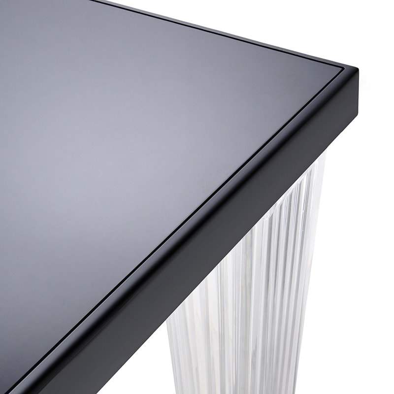 トップトップのダイニングテーブルは、グロッシーな面と透明な面を組み合わせたオリジナリティ溢れるテーブル。ミニマルでエレガントなラインを、プリーツのような筋の入った透明の脚が一層引き立てます。脚の断面は四角でメタル製の芯入りです。サイズと素材のバラエティがあり、様々な用途に対応します。