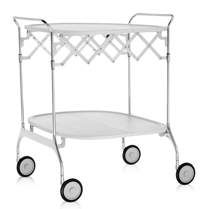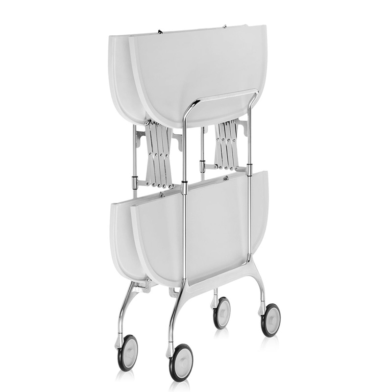 プラスチックのトップにクローム仕上げスチールフレームのコンビネーションがおしゃれなワゴン。折りたたみ式で、たたむとわずか23cmの厚さになり、収納も簡単です。キャスター付きなので移動も便利です。
