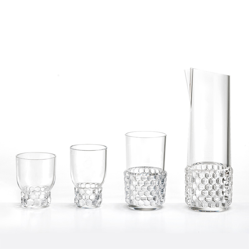 クリスタルガラスやダイヤモンドは、カッティングによって輝きや印象が変わります。このジェリーズも、表面のテクスチャ―デザインへのあくなき研究によって、今までのプラスチック製の食器では考えられなかった、驚きの美しさを実現させました。