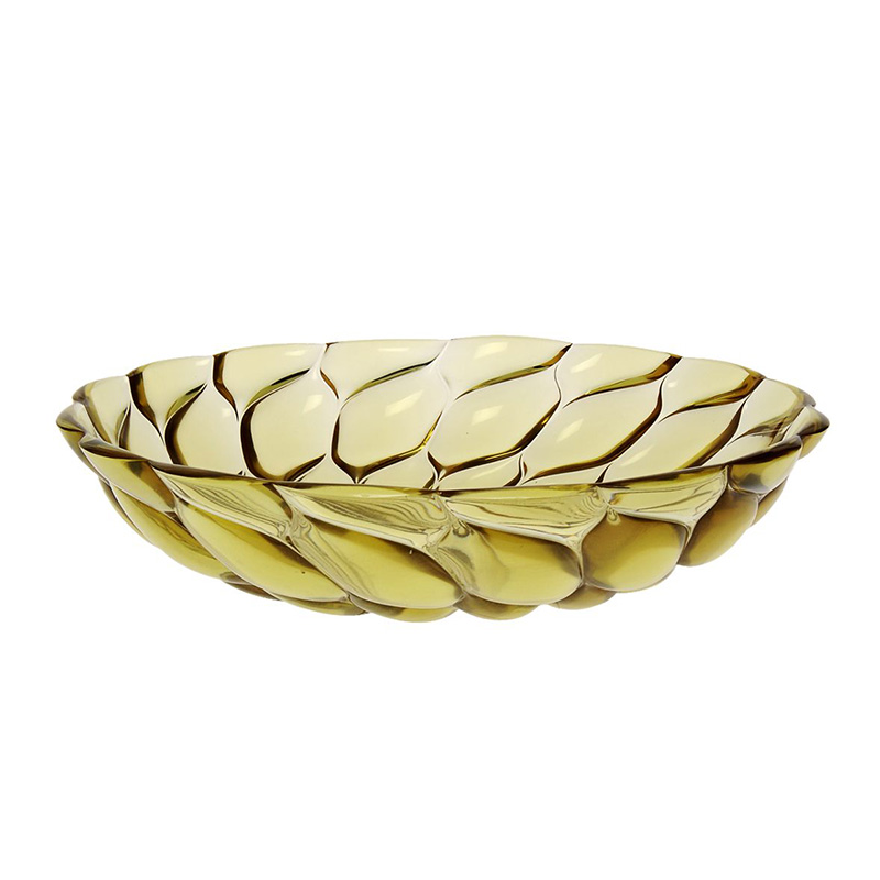 クリスタルガラスやダイヤモンドは、カッティングによって輝きや印象が変わります。このジェリーズも、表面のテクスチャ―デザインへのあくなき研究によって、今までのプラスチック製の食器では考えられなかった、驚きの美しさを実現させました。
