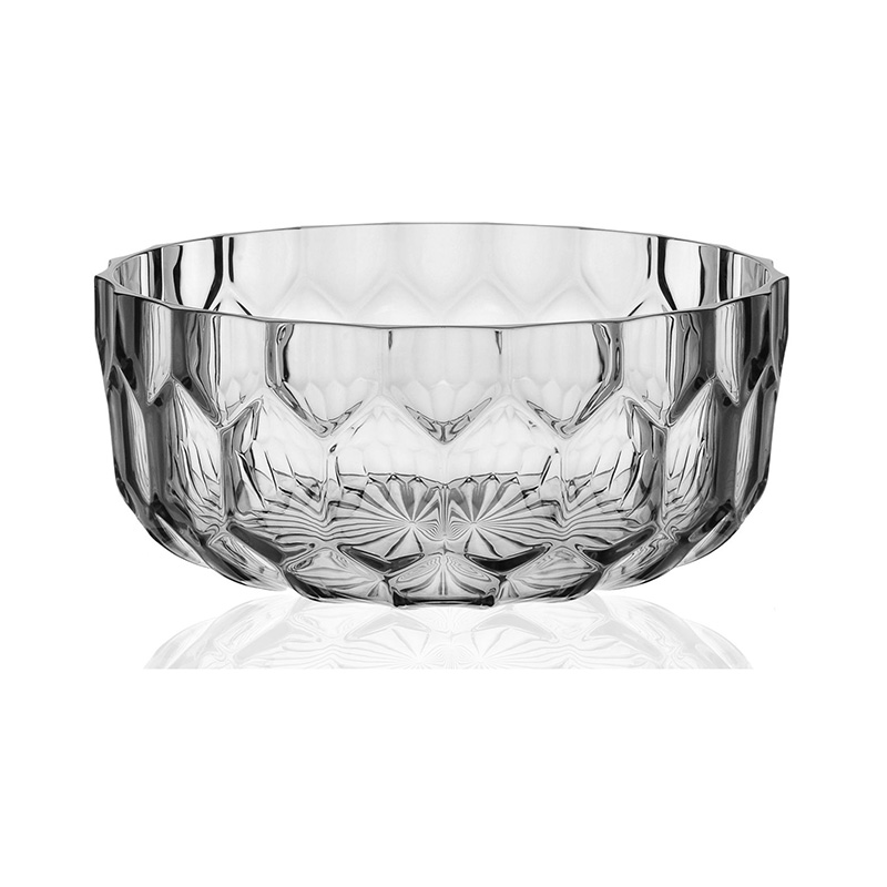 クリスタルガラスやダイヤモンドは、カッティングによって輝きや印象が変わります。このジェリーズも、表面のテクスチャ―デザインへのあくなき研究によって、今までのプラスチック製の食器では考えられなかった、驚きの美しさを実現させました。