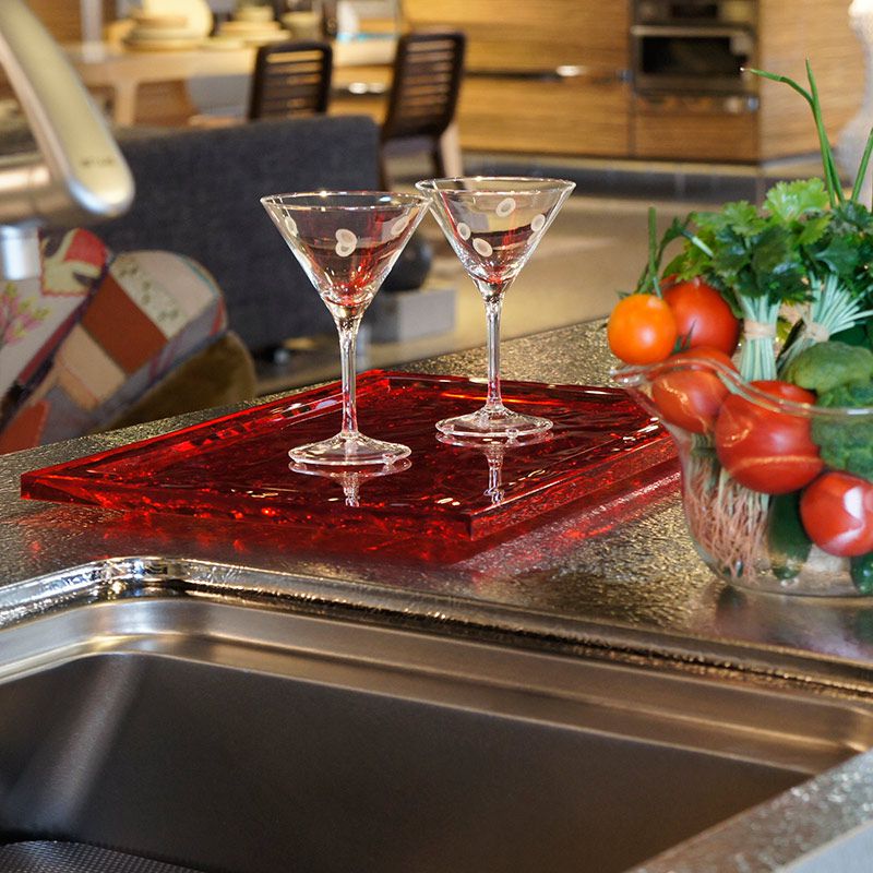 見る人や使う人に何も語りかけてこない存在感のないトレイなんて、つまらないとは思いませんか?物を運ぶためだけでパーソナリティのないトレイなんて。半透明のPMMAでできた彫刻のようなトレイは、色彩と光の輝きによりその上のグラスやカップを三次元的な不思議効果で演出します。ときに海の波、砂丘、つややかなシルク、さらには貴金属のように見えることもあります。これらの虹色のトレイは使う人に思いもよらない感動を与えるために創造されデザインされたものです。