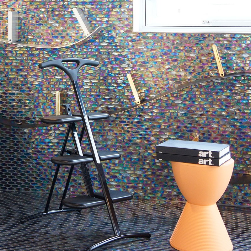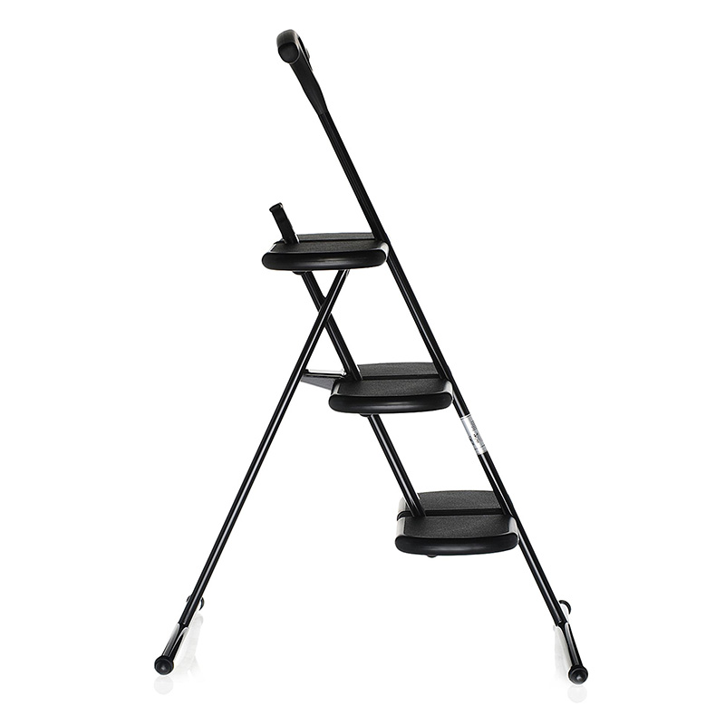 滑り止めのついた機能的な折りたたみ式3段脚立ティラミス。接地部のバーとハンドルのカーブにより、脚立としての安定性が得られるとともに、使用後はたたんで壁に掛けることができるようになっています。便利な開閉メカニズム、ニュートラルな色、エレガントなフォルム。これらがそろったティラミスはどんなインテリアとも無理なく合わせることができます。
