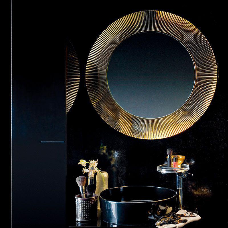 ラウンドしたプリーツ状のフレームは光の反射を意識したデザイン。これは、カルテルが生んだアイコニックな照明ブルジーを思い起こす、紛れもないバロック調の華麗なスタイル。人の姿を映し出す鏡としてだけでなく、インテリアとして光の効力を考えてつくられました。