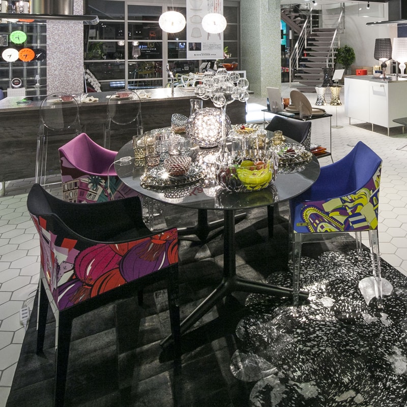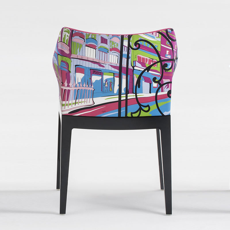 フィリップ・スタルクがカルテルのためにデザインした布張りのアームチェア「マダム」は、削ぎ落とされ洗練された直線の中のアームの曲線がモダンで美しいフォルムを実現しています。そこにエミリオ・プッチの代名詞ともいえる大胆なプリントが加わることで、アート作品のように見る者を楽しませてくれます。ブラックの脚はアートワークを強調し引き締まった印象、クリアの脚は宙に浮くような軽やかな印象を感じさせます。