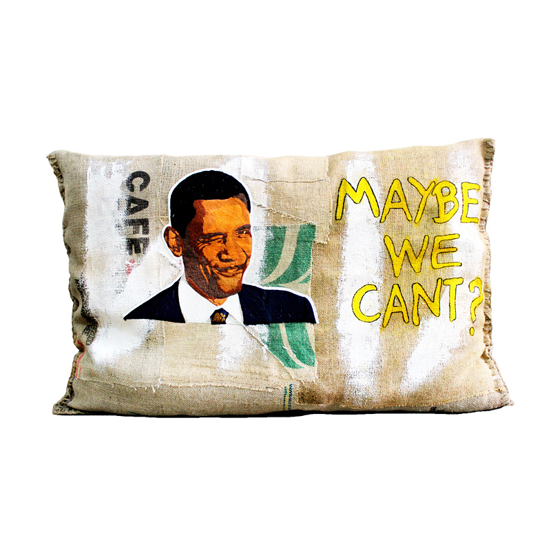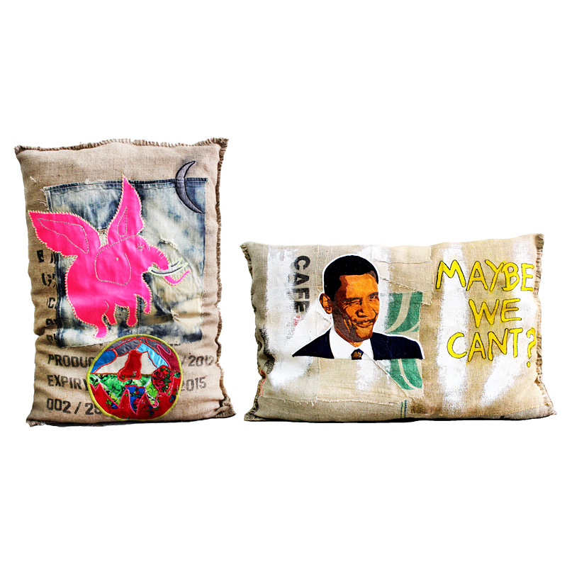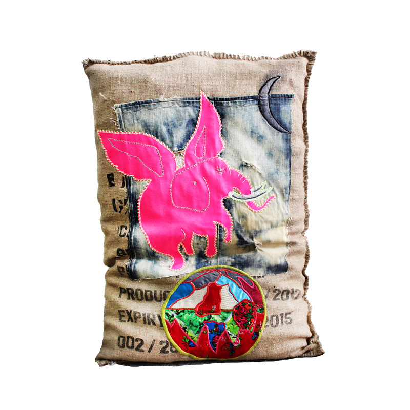 ジャイアントサイズで、コーヒー豆を入れる麻袋のようなテイストが新鮮です。イメージ写真の空飛ぶ象は、自らの嘘により重くなって飛べなくなった政治家たちを揶揄しています。