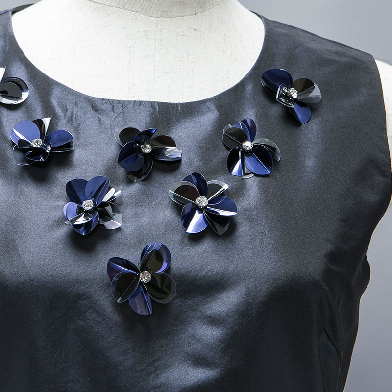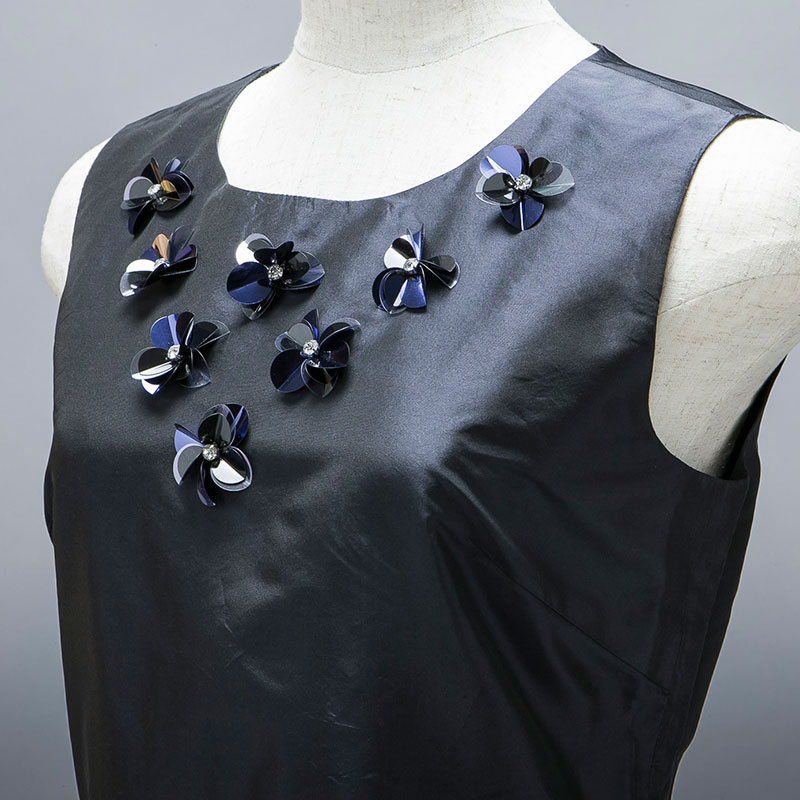 シルク100%生地を使用したノースリーブワンピースです。胸元にスパンコールのコサージュがアクセントになっています。