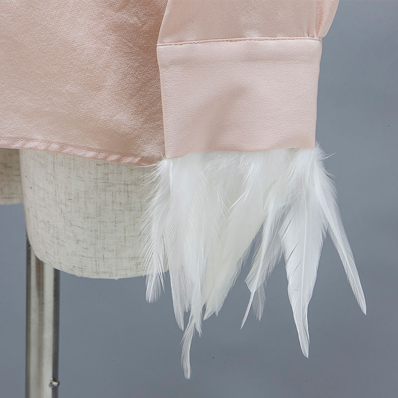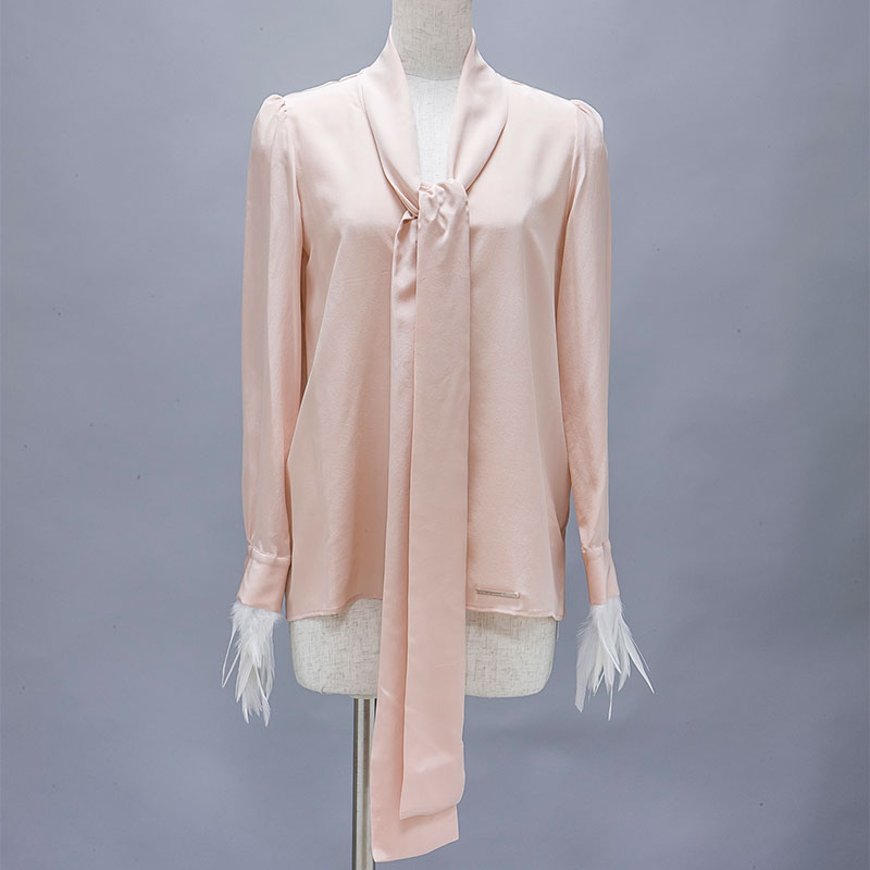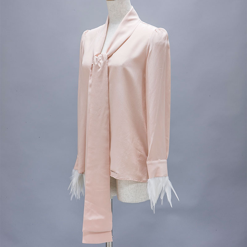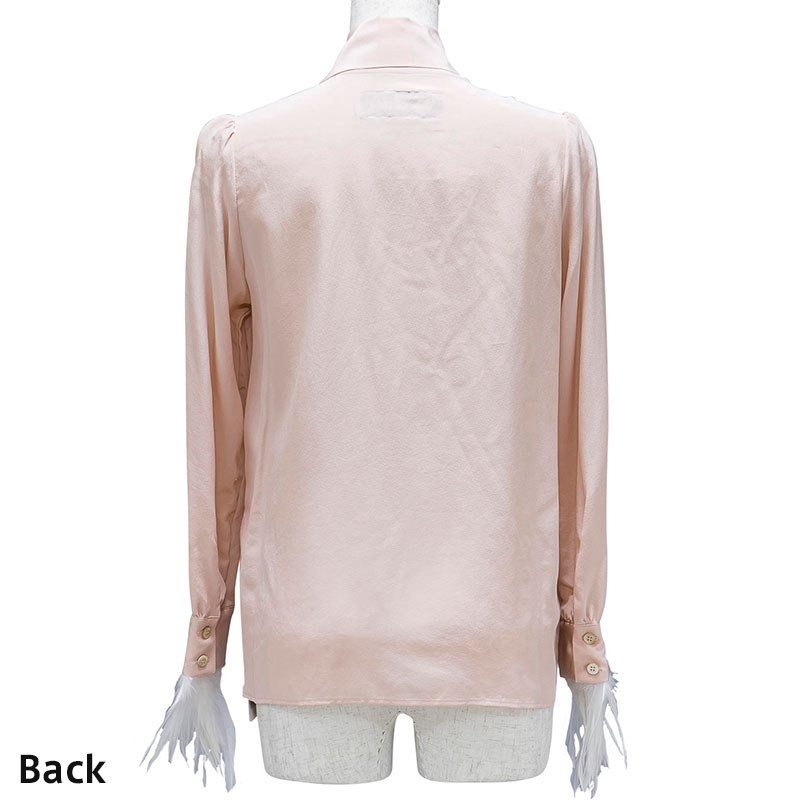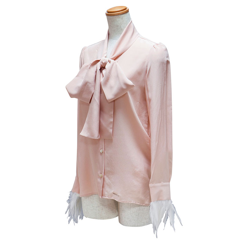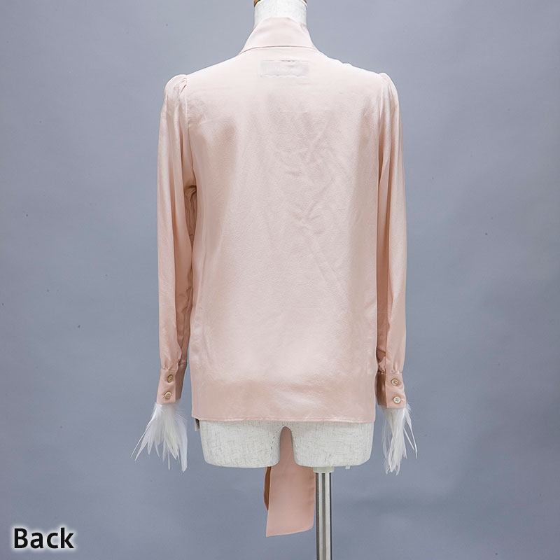 袖周りにフェザーをあしらったブラウスです。襟をリボン状にすることでフェミニンな雰囲気が特徴的です。。