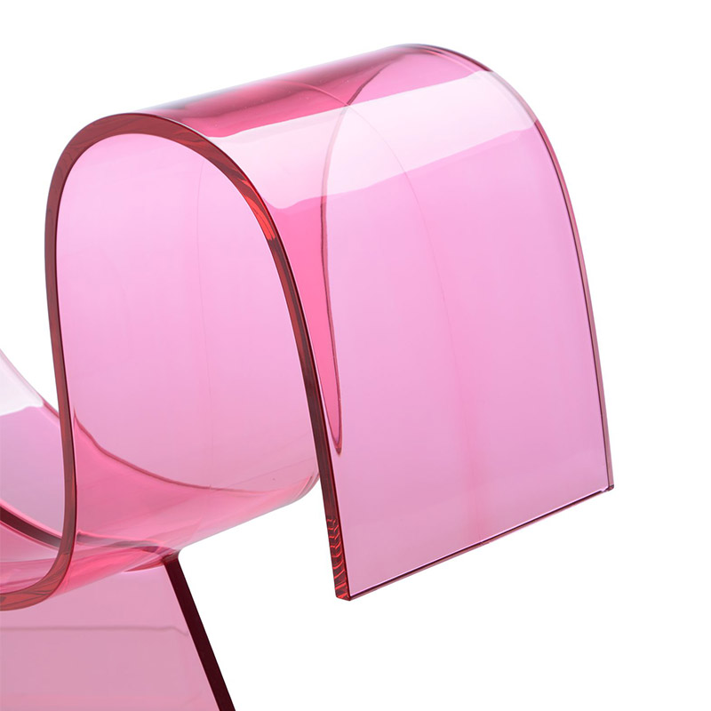 「nendo」デザインの透明ロッキングホース。高層ビルや橋に使用するH 型鋼柱の、少ない材料で高い強度が得られるH 型ビームの効率の良さに気づき、H 型ビームで幼児向けの遊具を作ってみようと考えたことで生まれました。