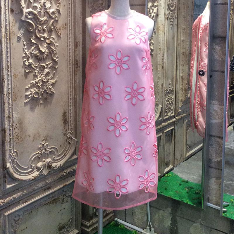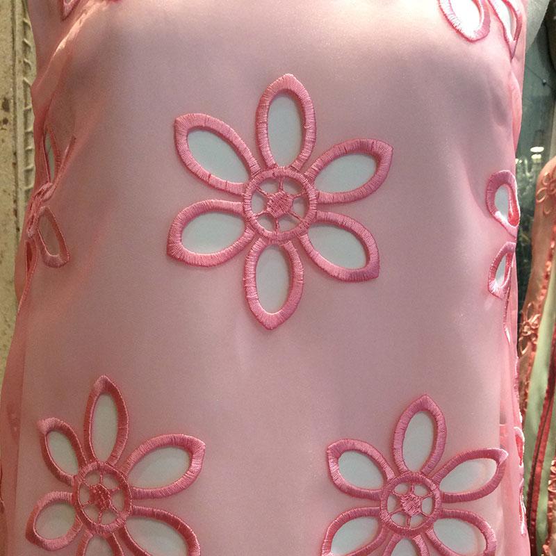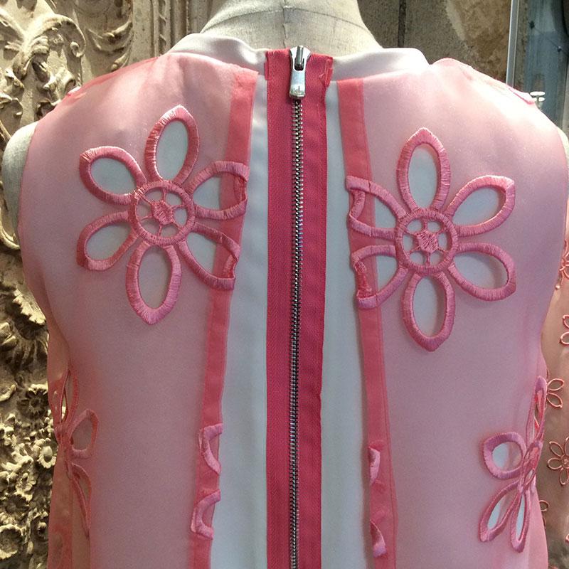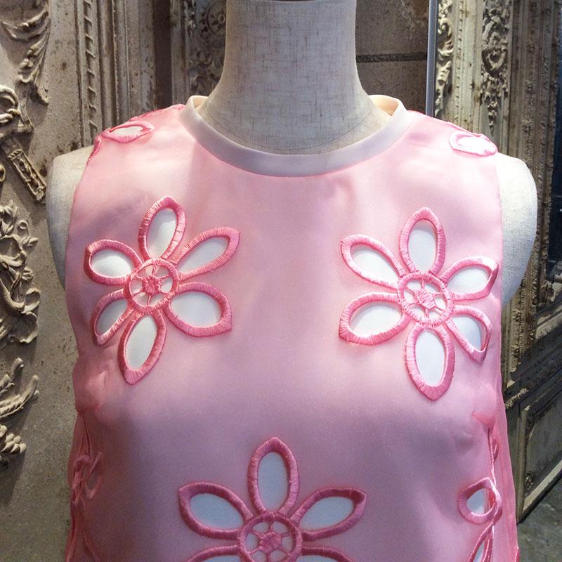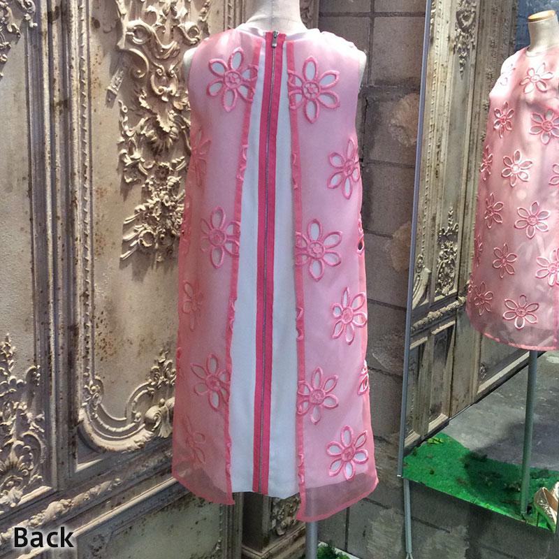 花柄の刺しゅうオーガンジーが華やかなレイヤードワンピースです。背面のピンク色ファスナーがアクセントとなっています。