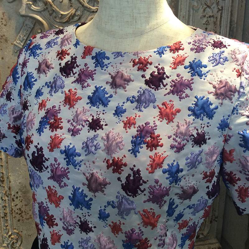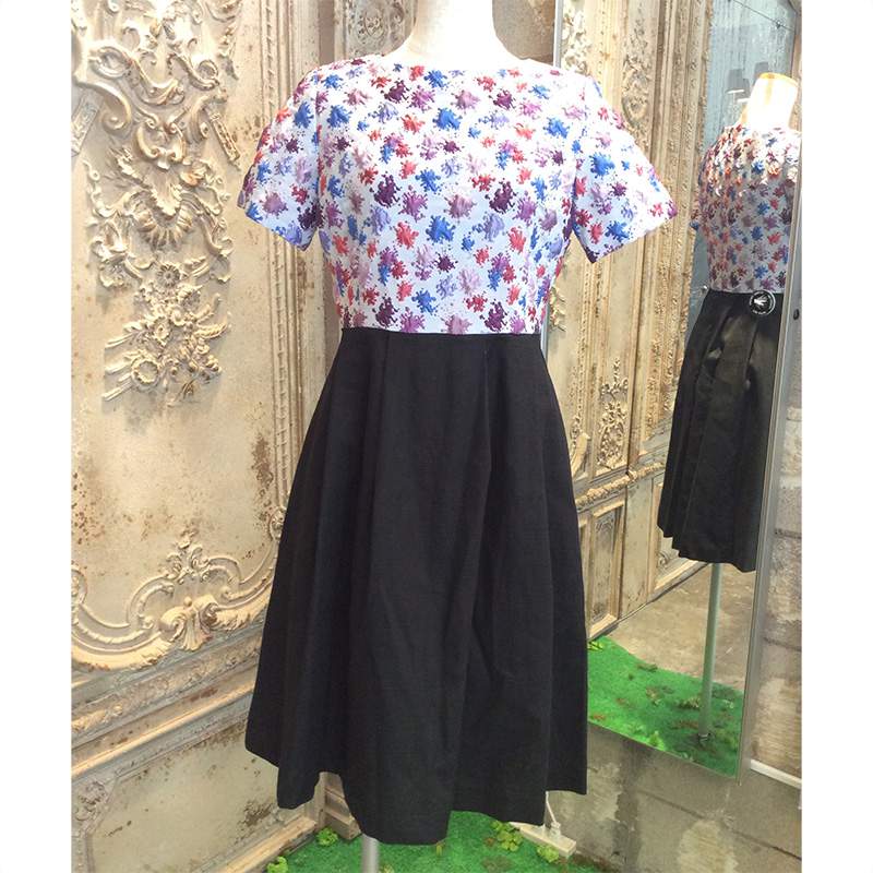 絵の具のパレットのような鮮やかな柄物のフクレ織り素材が特徴のコンビネーションワンピースです。