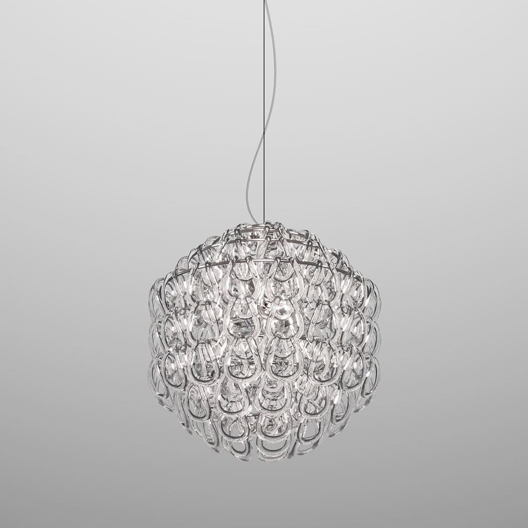 金属のアームや軸といった従来のシャンデリア構造を排除し、ガラスのオーナメントだけでフォルムを構成する革命的な照明です。