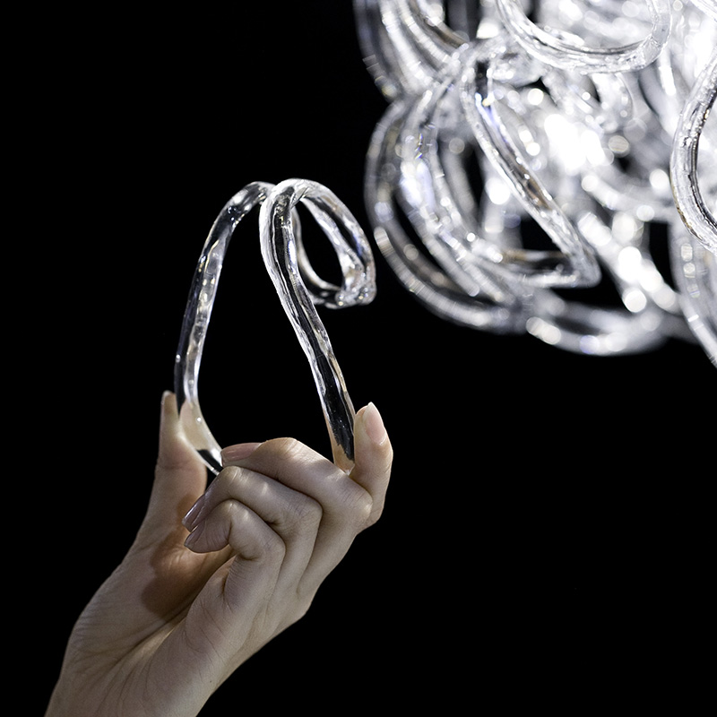 ジョガーリの構造は驚くほどシンプルです。光源を持つ金属リングに、C型のガラスパーツをチェーンのように連結させていくだけ。