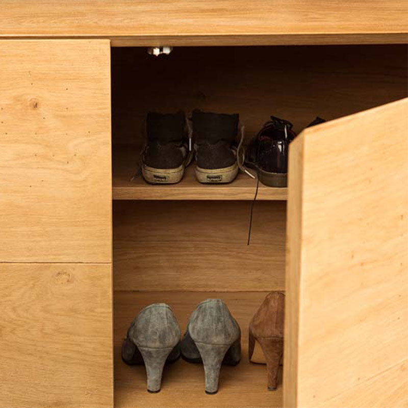 民家の梁のように剥き出しの材木を連想させるデザインの収納棚。