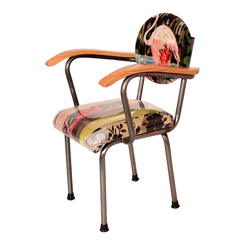 学校の椅子を彷彿とさせるプロポーションがスタンダードである以外、この椅子のデザインは何者にも縛られません。まるでスクラップブックのように異なるもの同士が偶然的に組み合わされ、予想外の魅力を生み出します。たとえば背もたれにはオービュッソン織り※1 の生地を採用したり、座面にはお守りや60-70年代の新聞の切り抜き、また個人的なメモに至るまで様々な材料のコラージュをカバー※2 してつくられます。