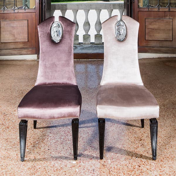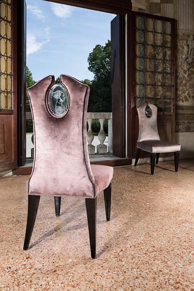 カメオチェアは、ヴェネツィアの河岸に建つかつての貴族の別荘ヴィラ・フォスカリの邸宅のような洗練された雰囲気をもっています。バックシートには、ピエロ・デル・ポッライオーロ(ルネサンス期のフィレンツェ出身の画家)による名画- 「ある女性の肖像」を連想させる美しいカメオで装飾され、古典的で品を感じさせる空間によく似合います。