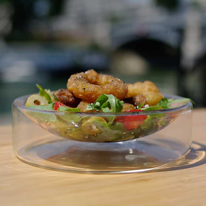 ガラスボウルの中に空気を閉じ込めることで断熱性と食材がまるで宙に浮いたようなデザイン性の高さを両立しています。