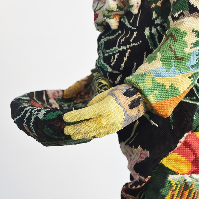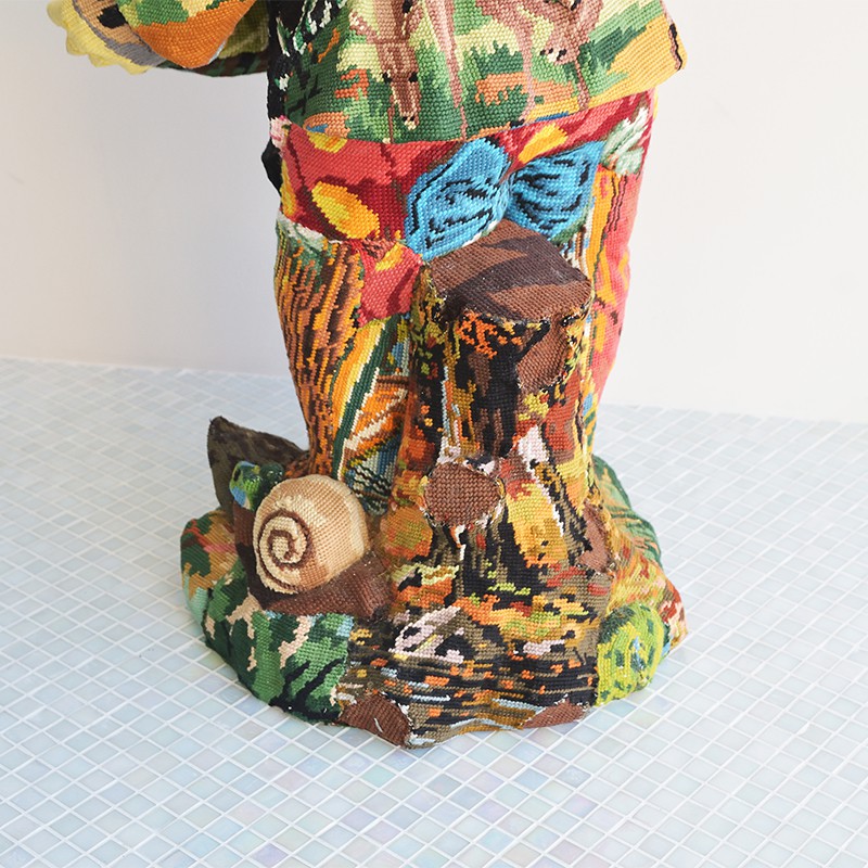 キャンパス生地全体をウールの糸で刺繍を施す技法。仕上がりはまるで織物のような印象で、ウール糸を使用することから、タペストリーとして装飾として用いるだけでなく。室内の温度調整の役割も果たす実用性も兼ね備えています。