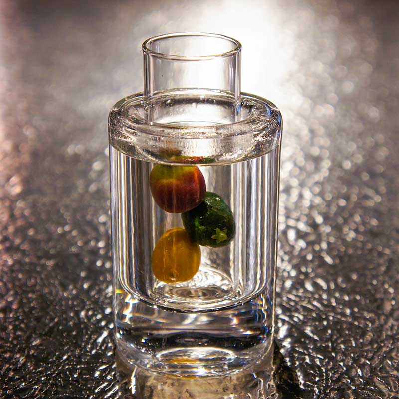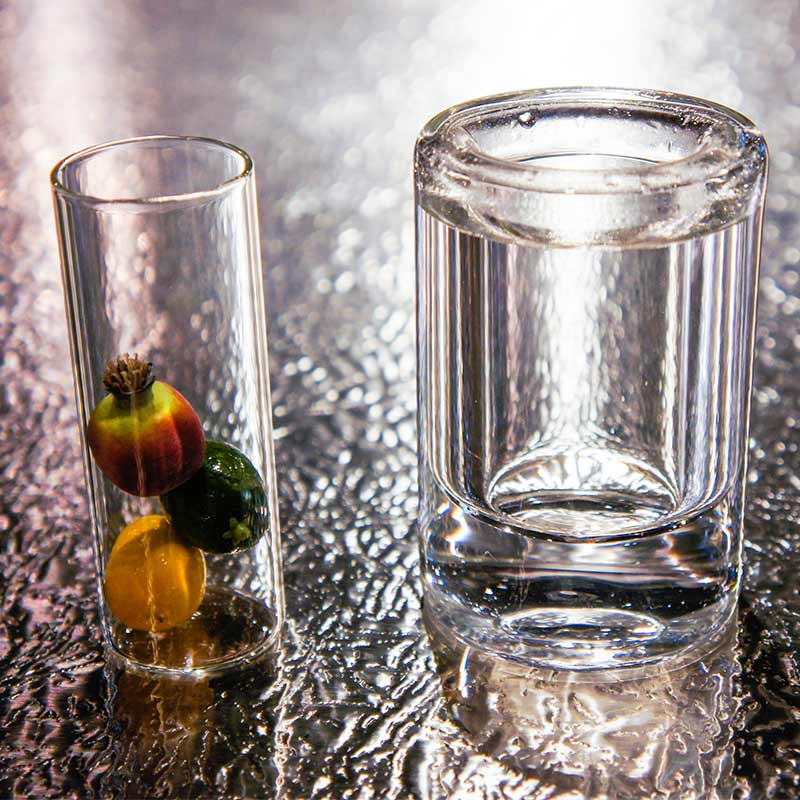 上部と下部のパーツに別れるグラスです。透明な液体入りの下部パーツを冷やしておき、上部パーツに飲み物を入れることで薄まることなくその味を楽しむことが出来ます。