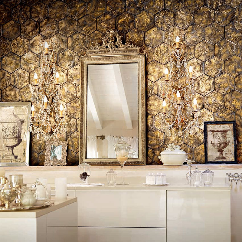 高度な生産技術を用いて、金やプラチナを織り交ぜたラグジュアリーなタイルなど、個性的で多彩な空間を演出しています。