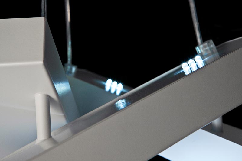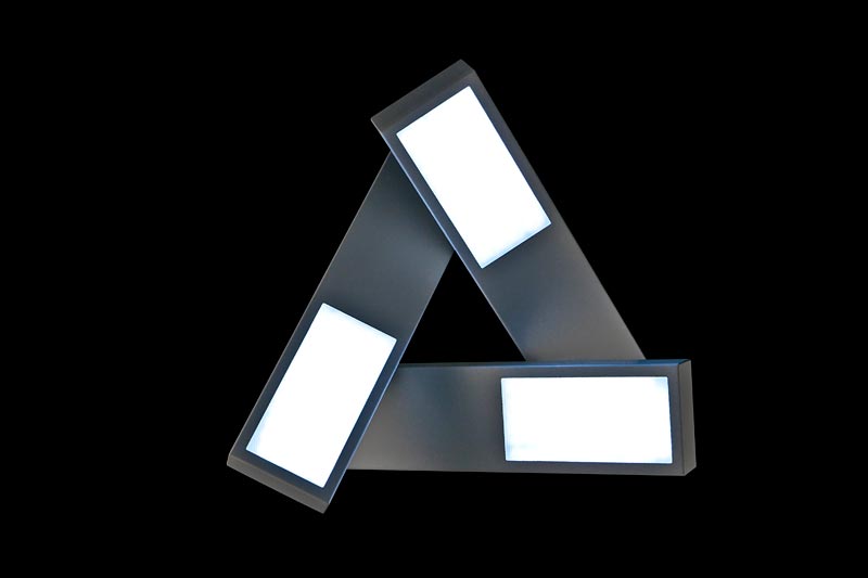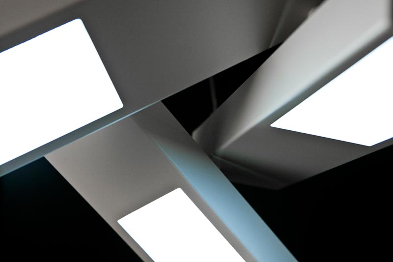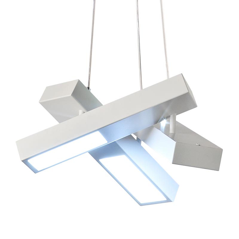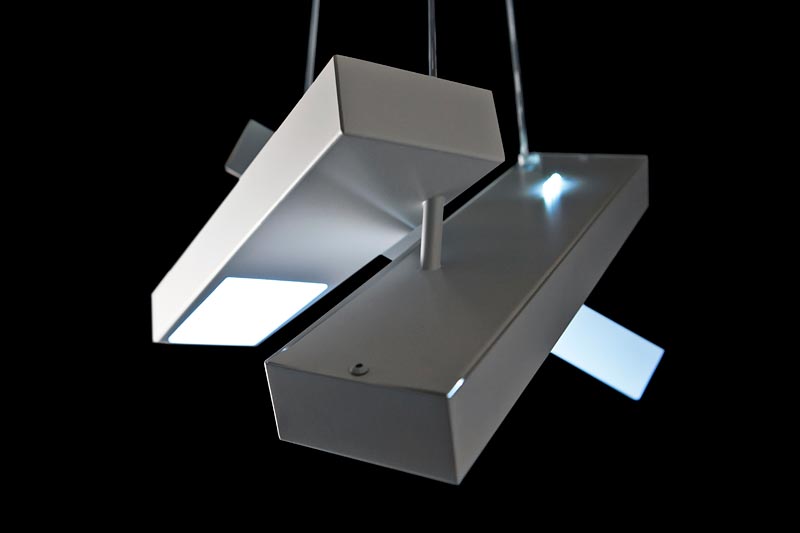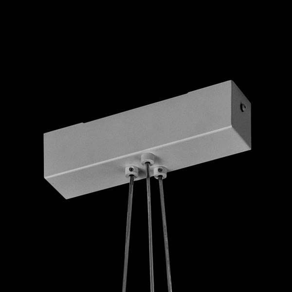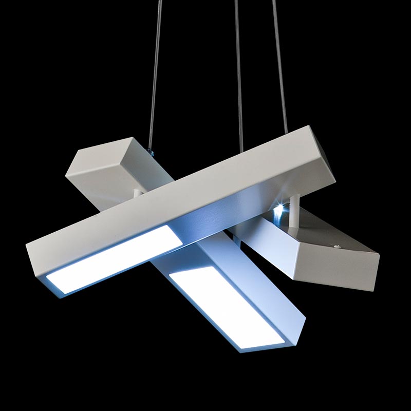 3灯のペンダントライトがランダムに宙で交差して、まるでマリオネットのコントローラーのような印象。一見すると規則性がないようにハンギングされていますが、下から見上げると、正三角形を描くようにきれいにクロスするように計算されています。
