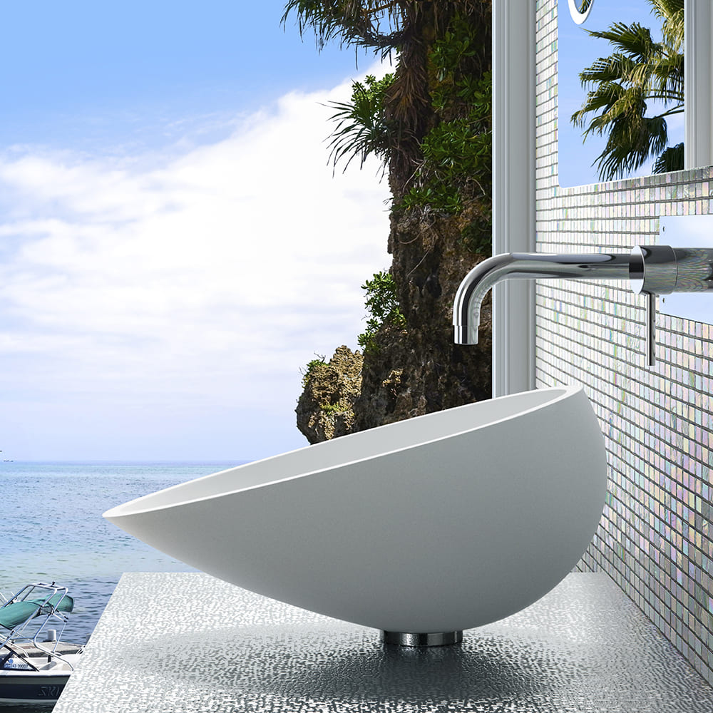 樹脂にガラス成分を混ぜることで生まれた、先端素材で作られた洗面ボウルです。