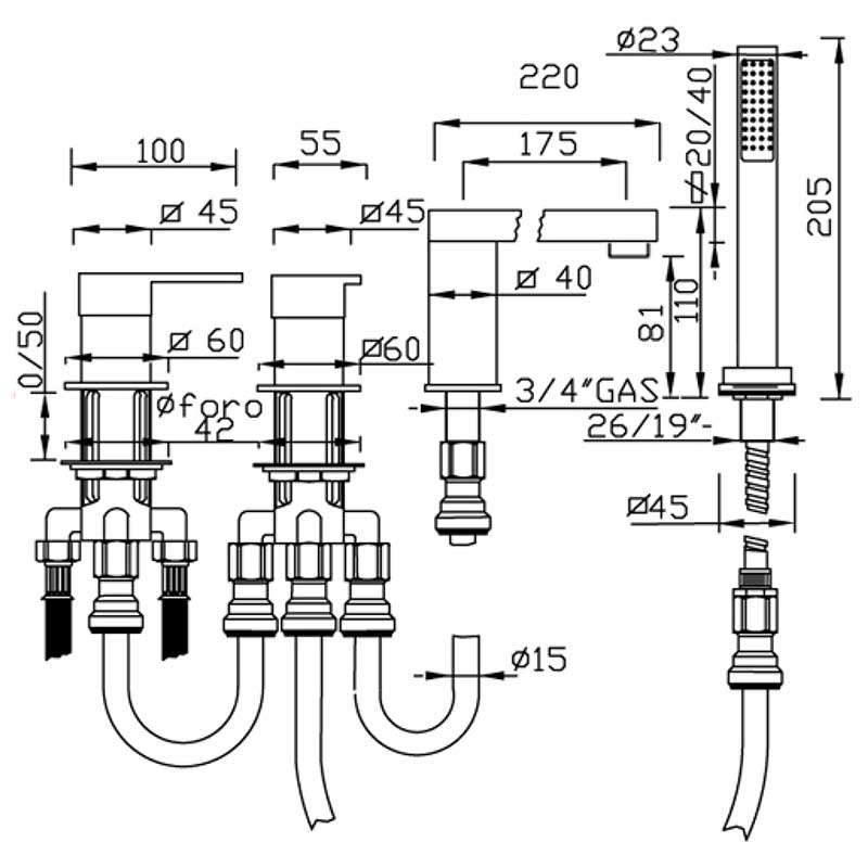 トップ取付穴:吐水部φ2.8/レバー部φ4.5(2箇所)/シャワー部2.8cm