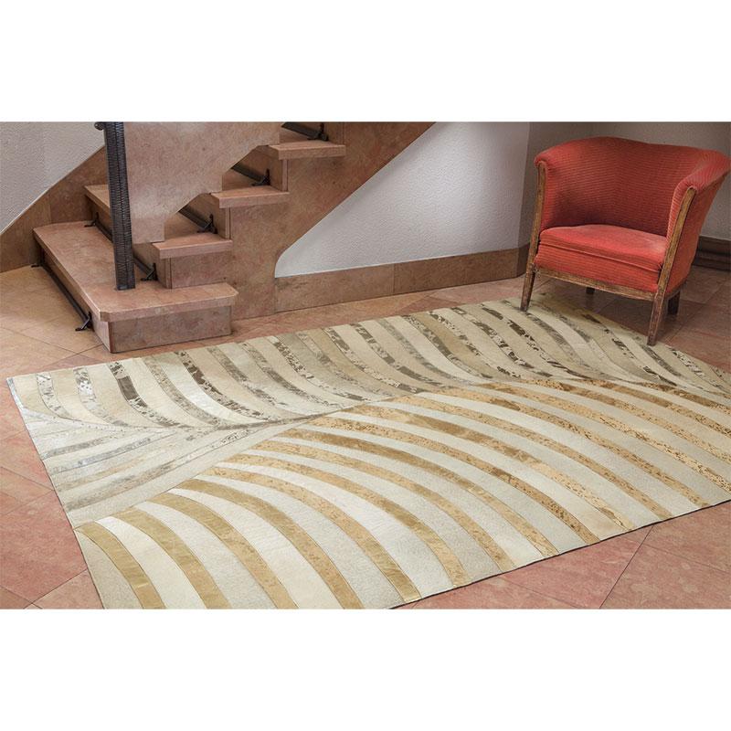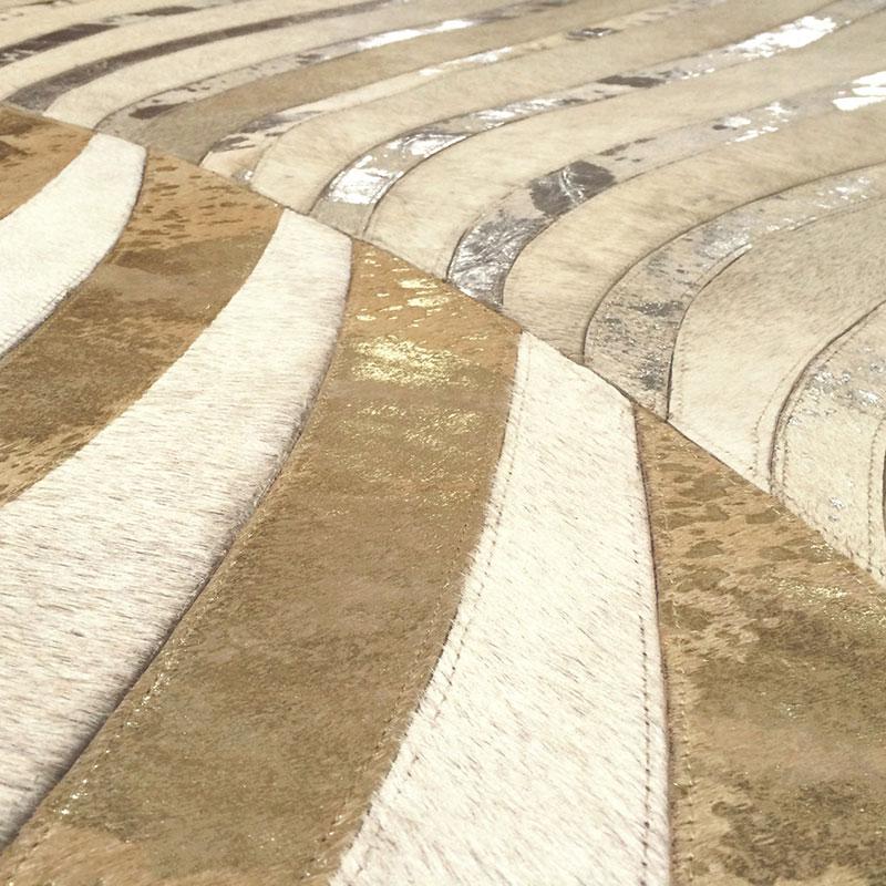 全体的にハラコ素材の切替でパターンや模様を表現したラグです。ゴールドやシルバーなどのカラーリングもウールなどでは出せないハラコならではの特徴です。