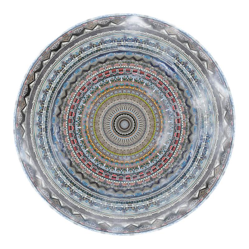 都市を代表する象徴的な風景や建物を、ヒンドゥー教や仏教の象徴である曼荼羅(まんだら)に見立て、ぐるりと円状にコラージュした作品。