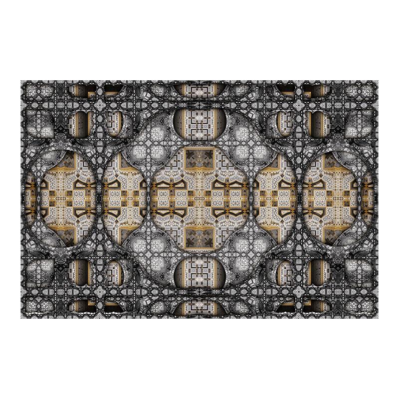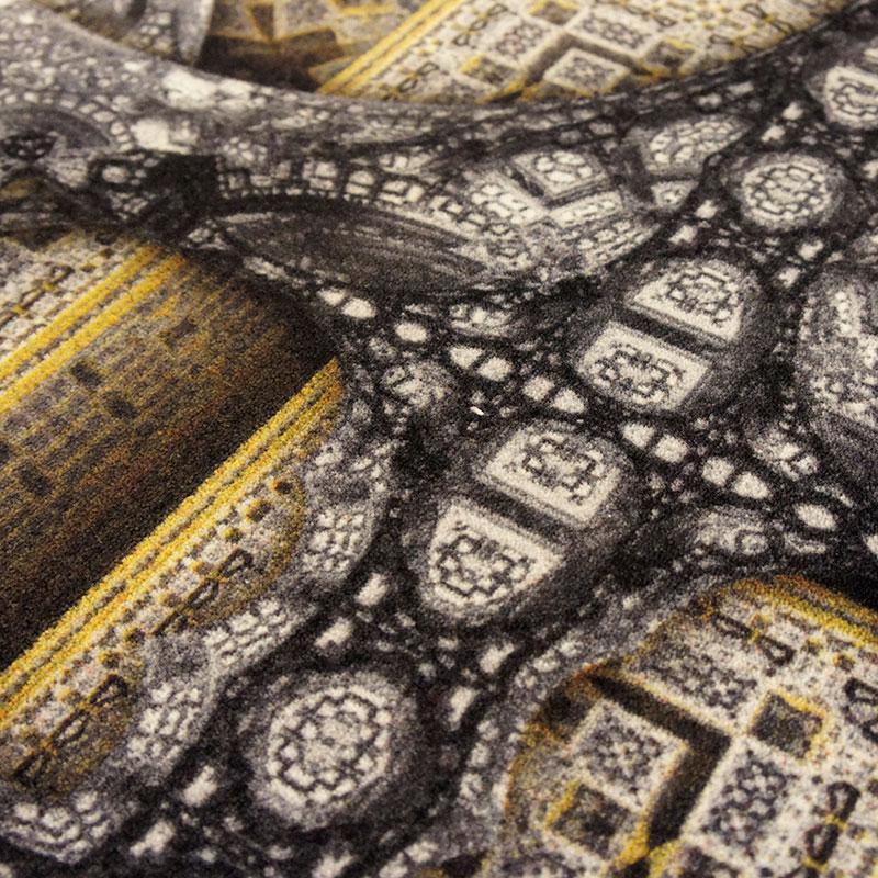 神秘的で数学的な要素と、他に類を見ない華麗さを特徴とする貴重な装飾パターンで構成されています。こちらも、遠くで見るとチェックの織物の様に見え、近くではモスクに施された装飾を2次元に置き換えた繊密な模様の2面性を楽しむことができます。