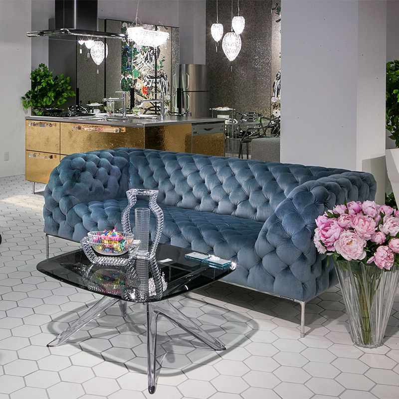 透明なガラストップとポリカーボネートの脚が組み合せらせたローテーブル。トップにはカラーバリエーションがあり、美しい透明なカラーレイヤーを楽しむこともできます。