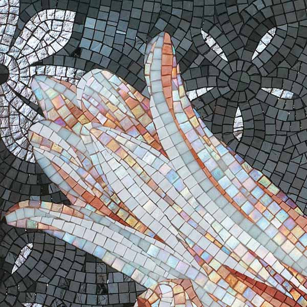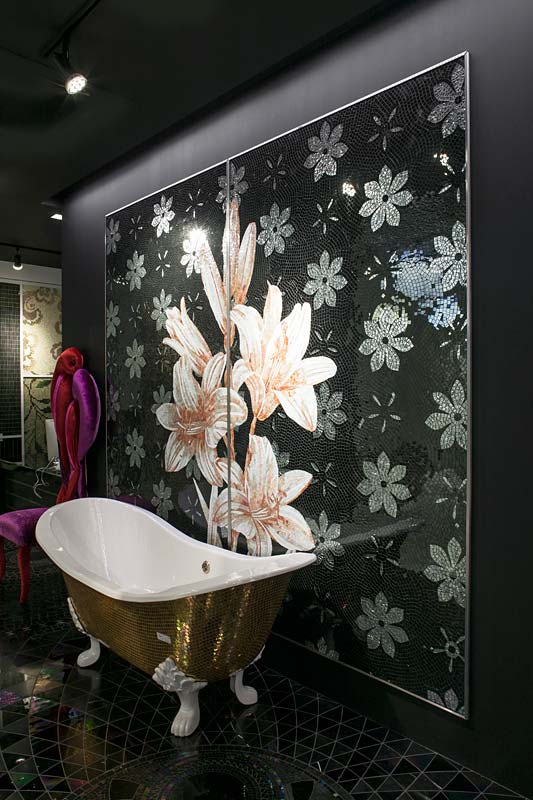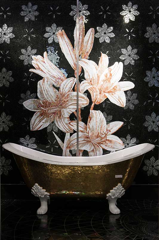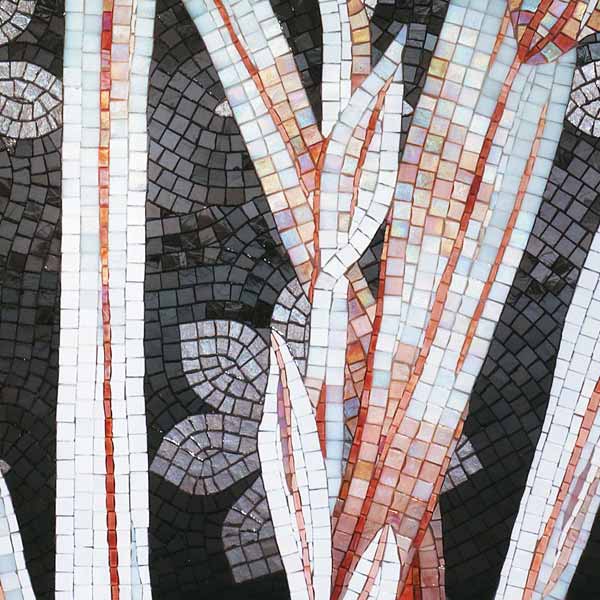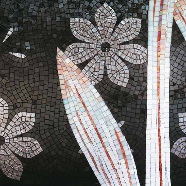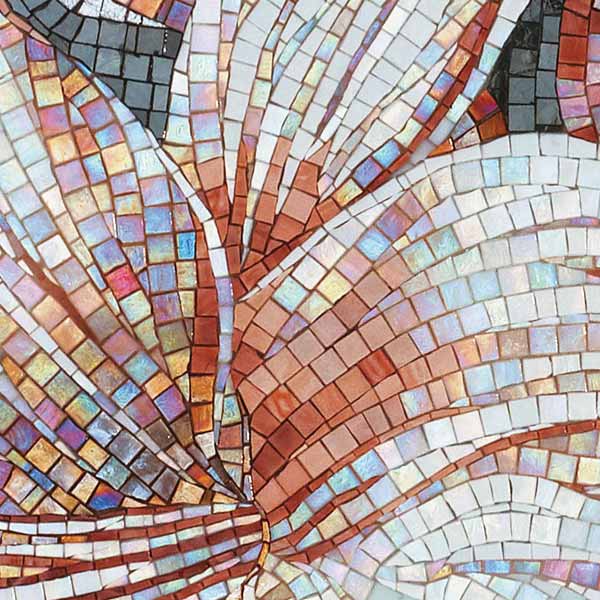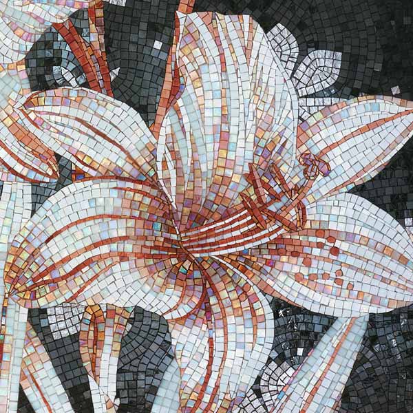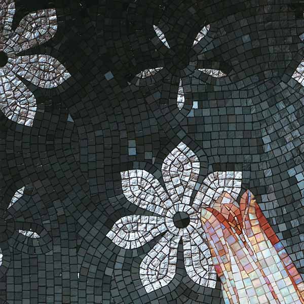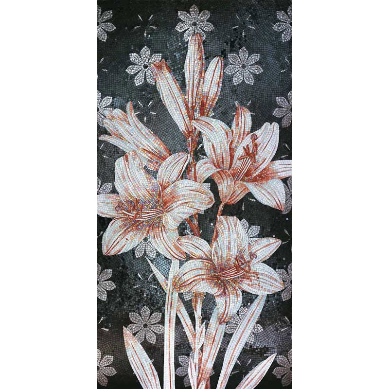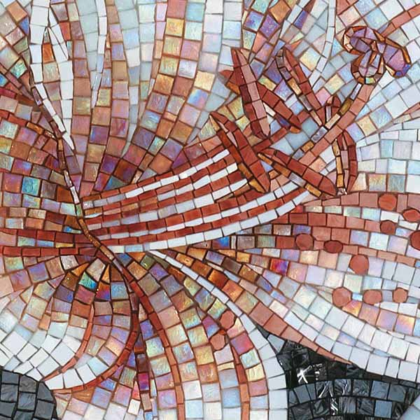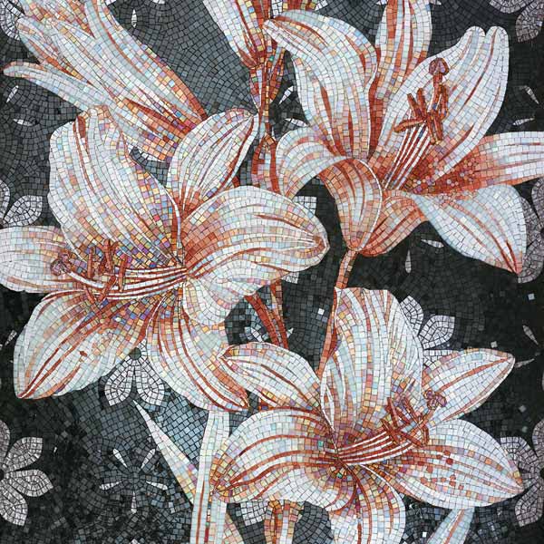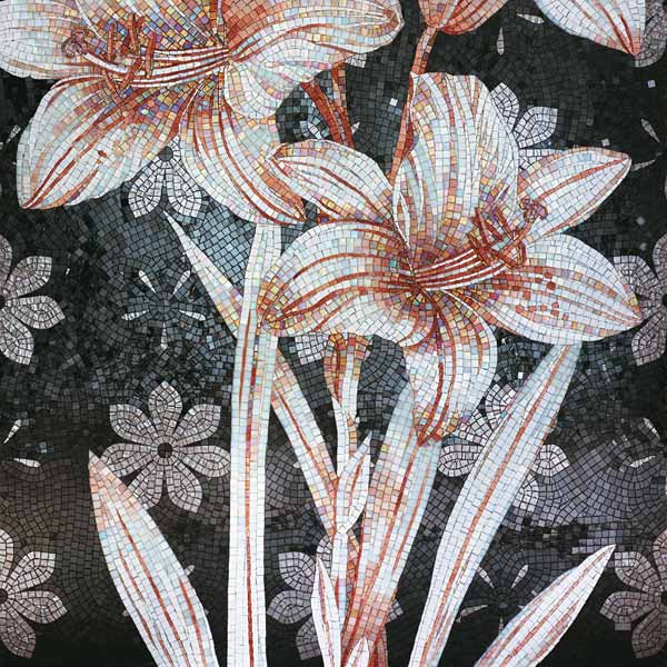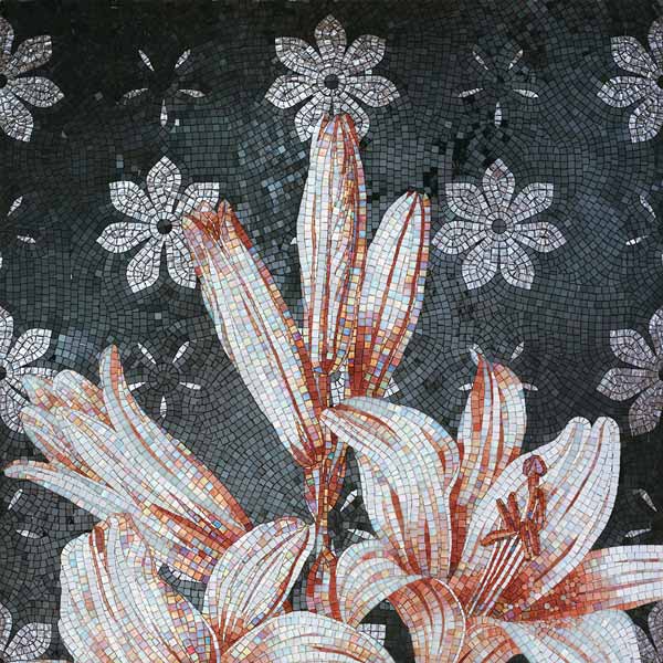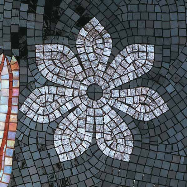 イタリア、ラヴェンナのモザイク職人が、すべてモザイクのハンドワークによって描いた美しい花々です。べネツィアンガラスの鮮やかな色彩によって表現された花たちは、透明感のある煌びやかさをもっています。熟練した職人が絵柄に合わせ、ベネツィアンモザイクを1枚1枚手割りして繊細に描いたモザイクアートです。