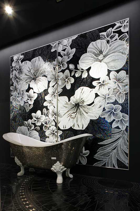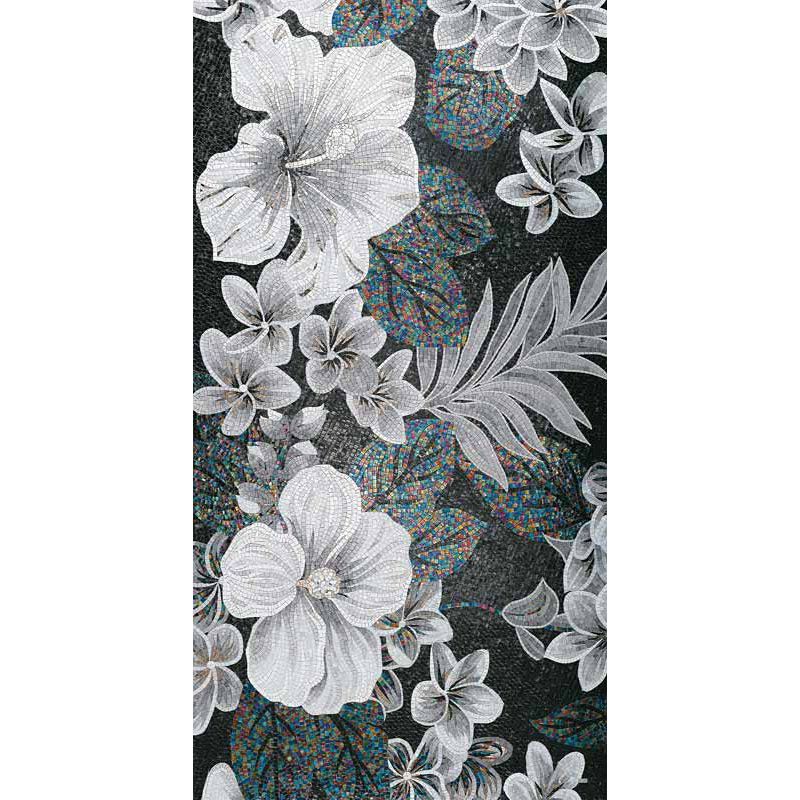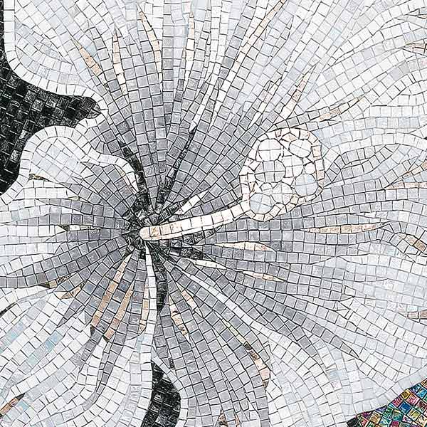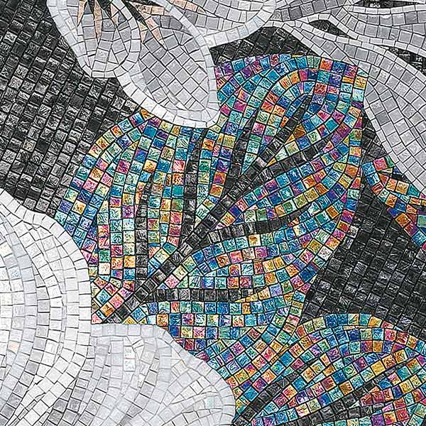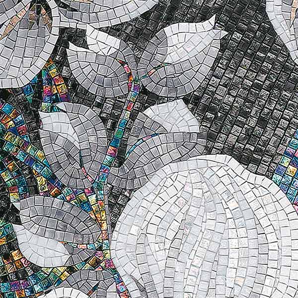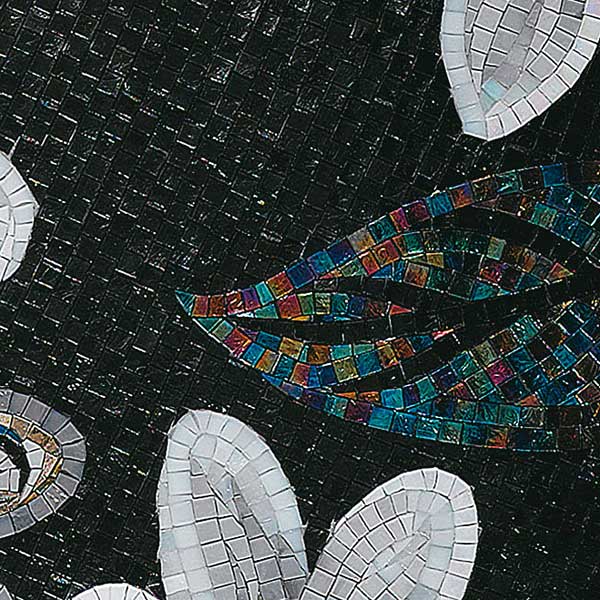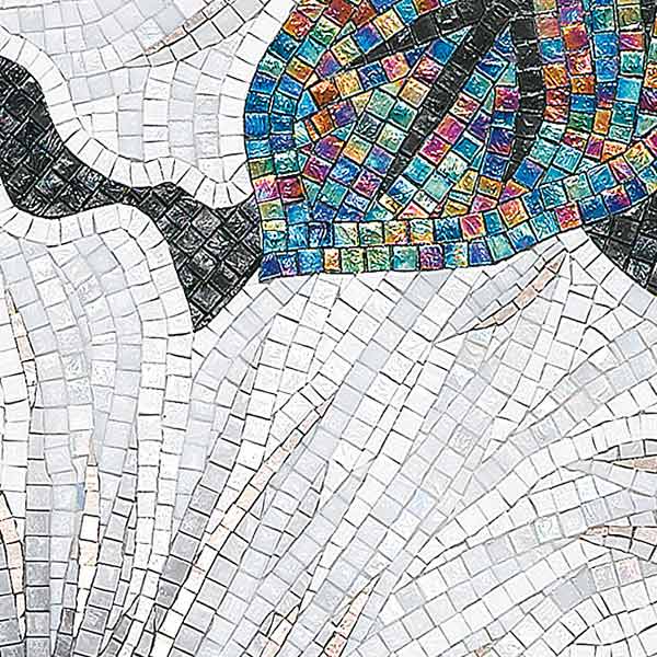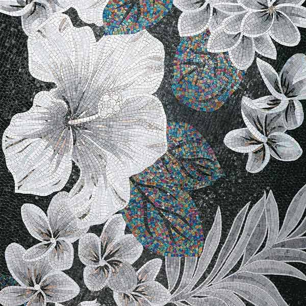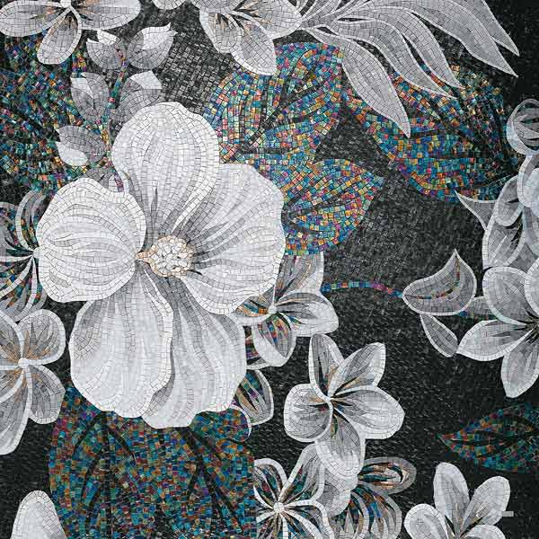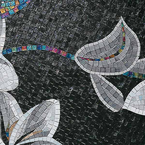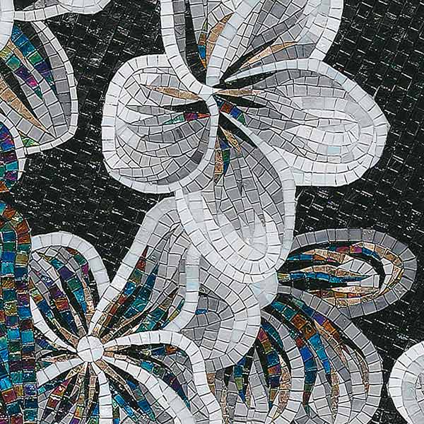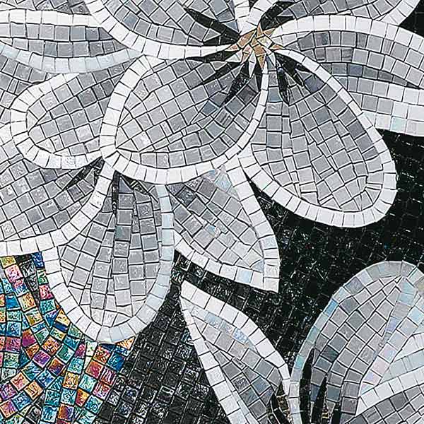 イタリア、ラヴェンナのモザイク職人が、すべてモザイクのハンドワークによって描いた美しい花々です。べネツィアンガラスの鮮やかな色彩によって表現された花たちは、透明感のある煌びやかさをもっています。熟練した職人が絵柄に合わせ、ベネツィアンモザイクを1枚1枚手割りして繊細に描いたモザイクアートです。