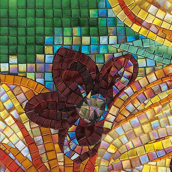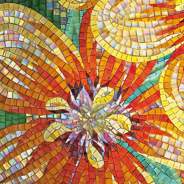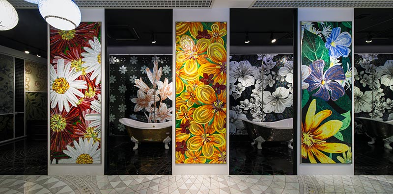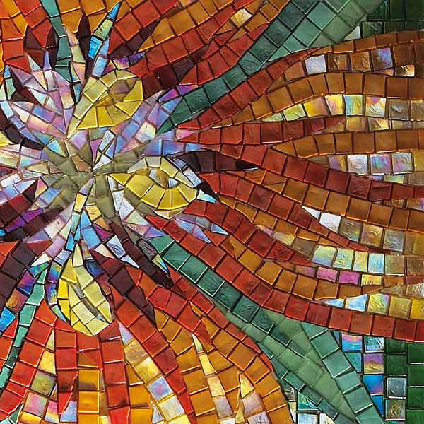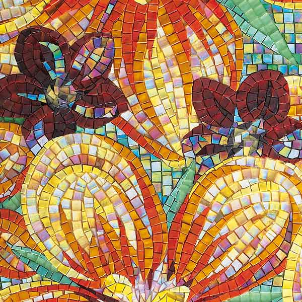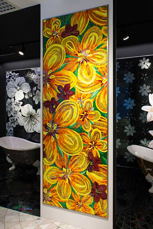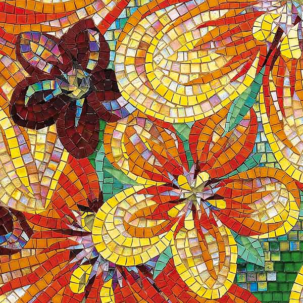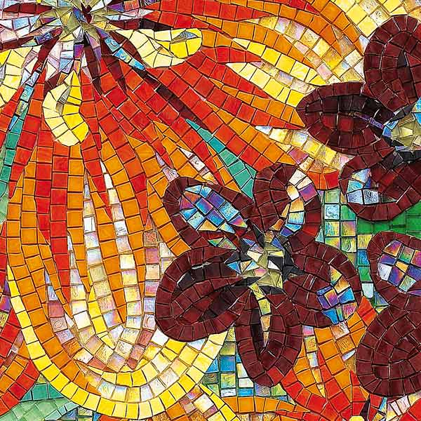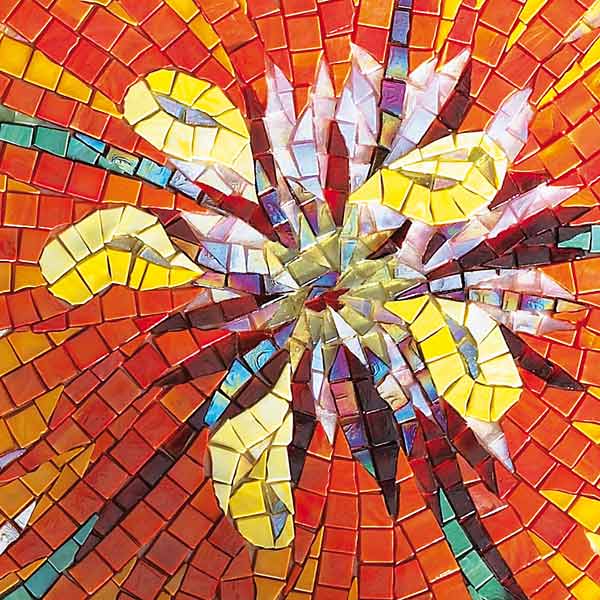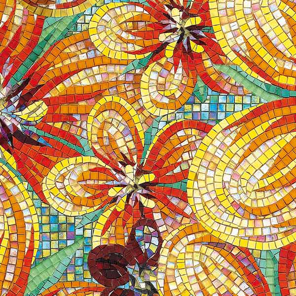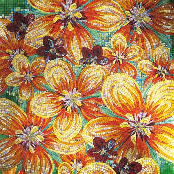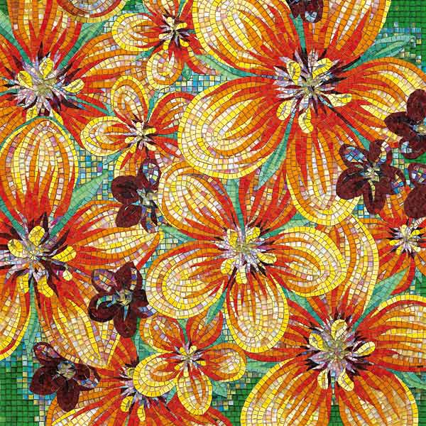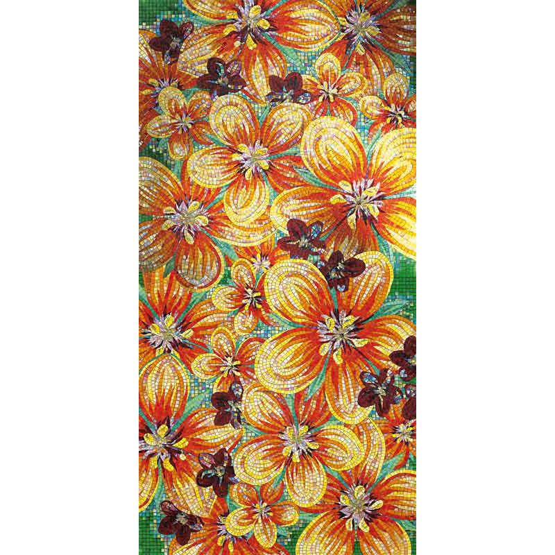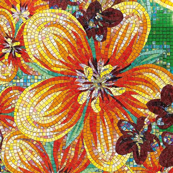 イタリア、ラヴェンナのモザイク職人が、すべてモザイクのハンドワークによって描いた美しい花々です。べネツィアンガラスの鮮やかな色彩によって表現された花たちは、透明感のある煌びやかさをもっています。熟練した職人が絵柄に合わせ、ベネツィアンモザイクを1枚1枚手割りして繊細に描いたモザイクアートです。